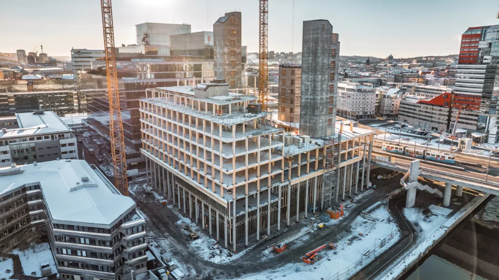 Stomme: 12 våningar av 16 byggs med stomme helt i trä.