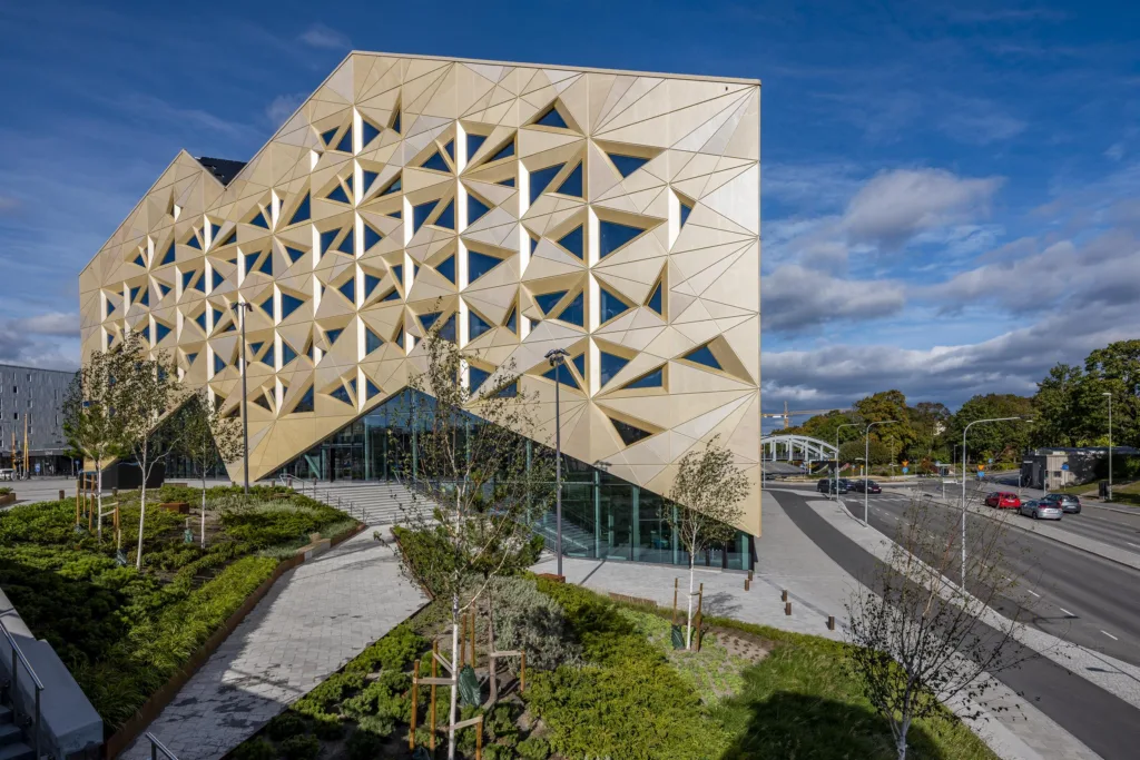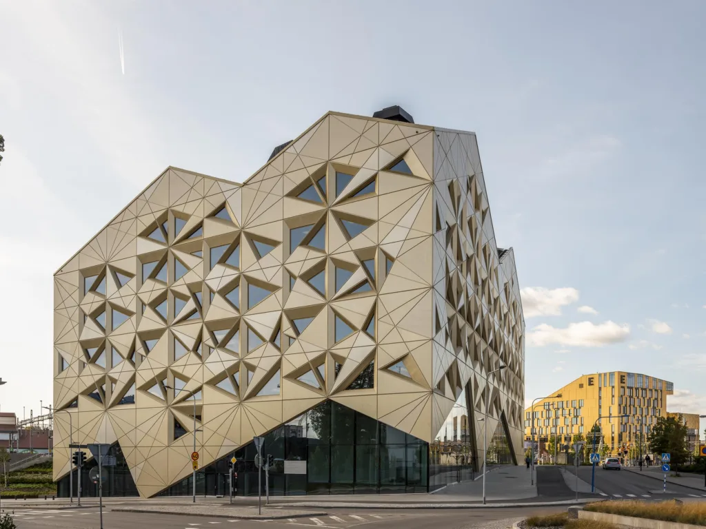 Byggnaden stod färdigt 2019 och har högsta miljöcertifiering. Guld och glas är genomgående vilket skapar ett fint inflöde av ljus och ger hela huset en speciell känsla av kreativitet och lekfullhet. Oavsett våningsplan påminner de trekantiga fönstren dig om att du befinner dig just i Juvelen.
