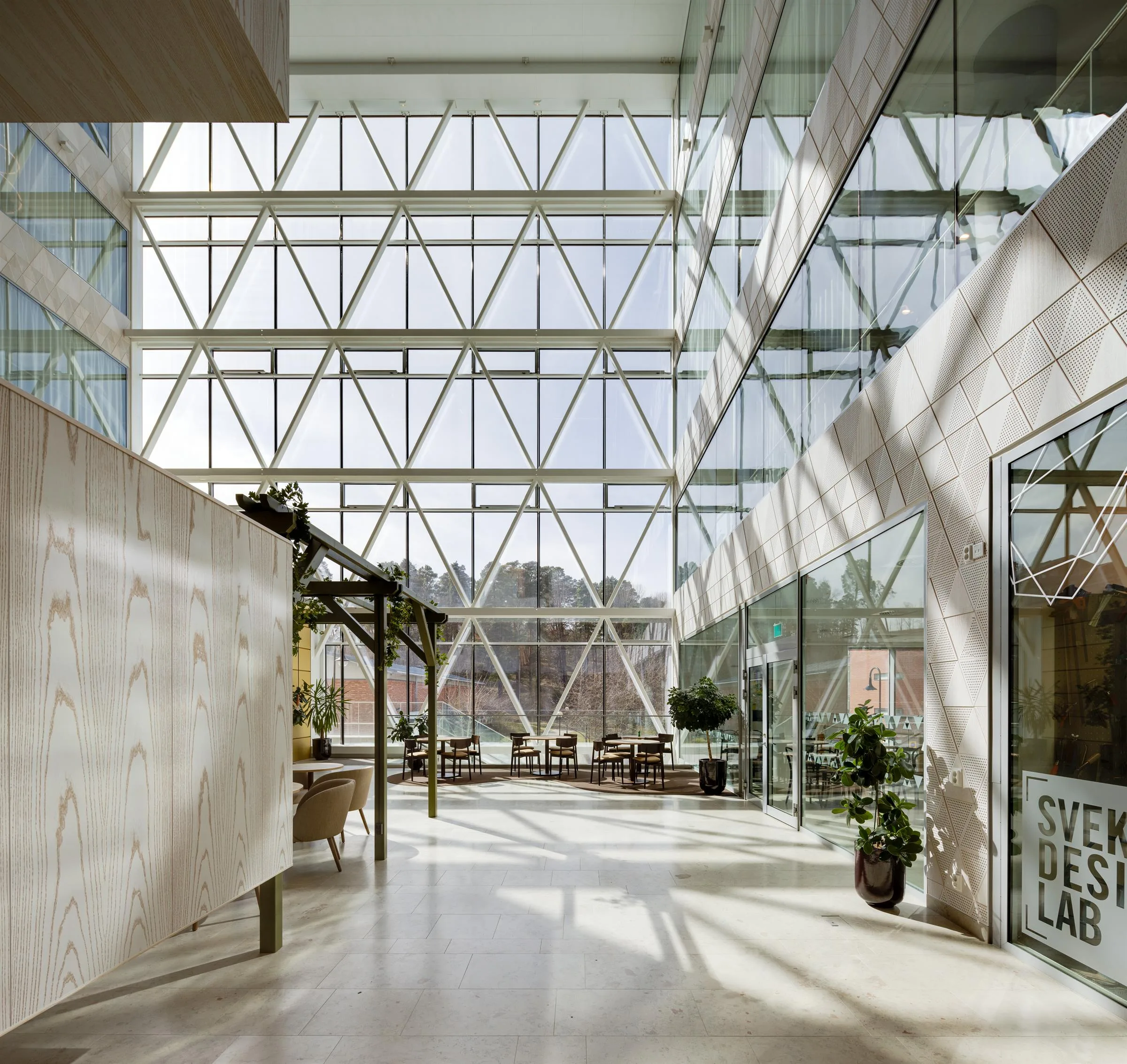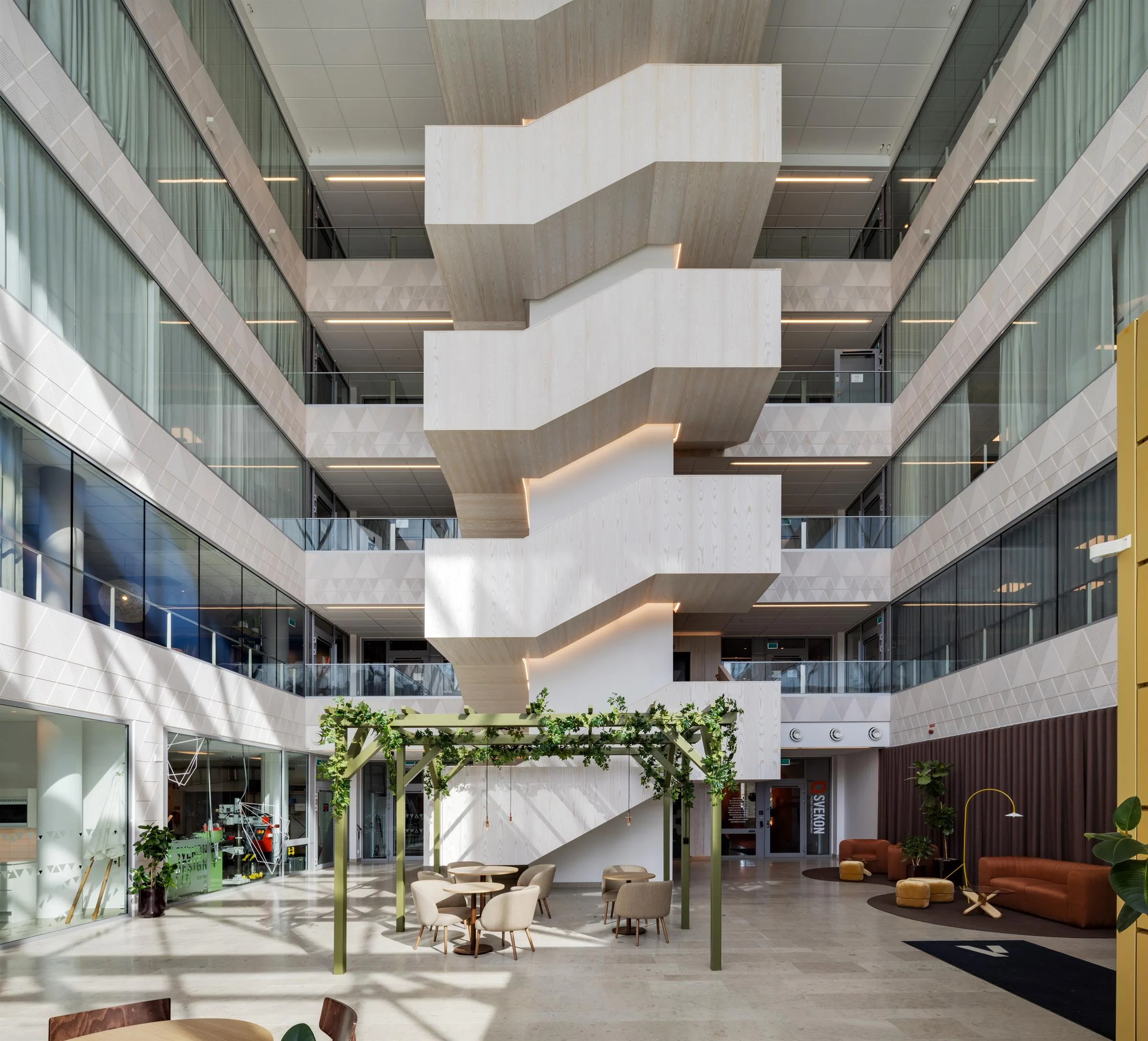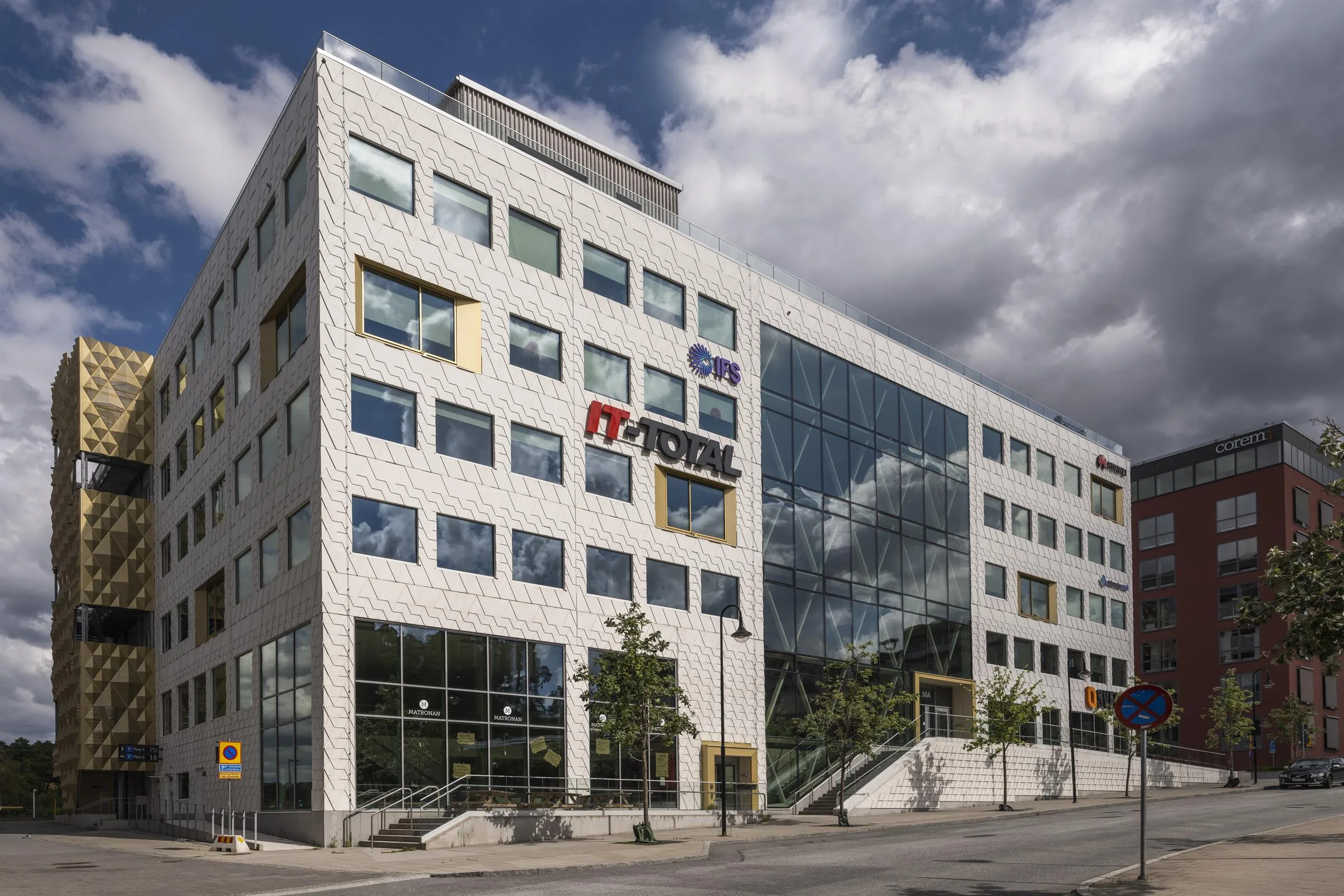 Fastigheten har en fasad med vit-mönstrad betong, trä samt mässing, allt i ett triangelmönster som får fastigheten att gnistra. Fastigheten är byggd med högsta möjliga miljöklass! Byggnaden har nio kontorsplan med café, cykelhubb och garage längst ner. Den välkomnande entrén på plan 3, med en välmöblerad lounge, i det stora atriumet ger ljus och rymd. De två översta våningsplanen är byggda helt i trä. I fastigheten finns cirka 1 000 arbetsplatser, och varje våningsplan erbjuder ca 1 600 trevliga, effektiva och moderna kvadratmeter. Förutom ett av Sveriges absolut bästa skyltlägen finns både takterrass och taklounge tillgänligt för husets alla gäster.