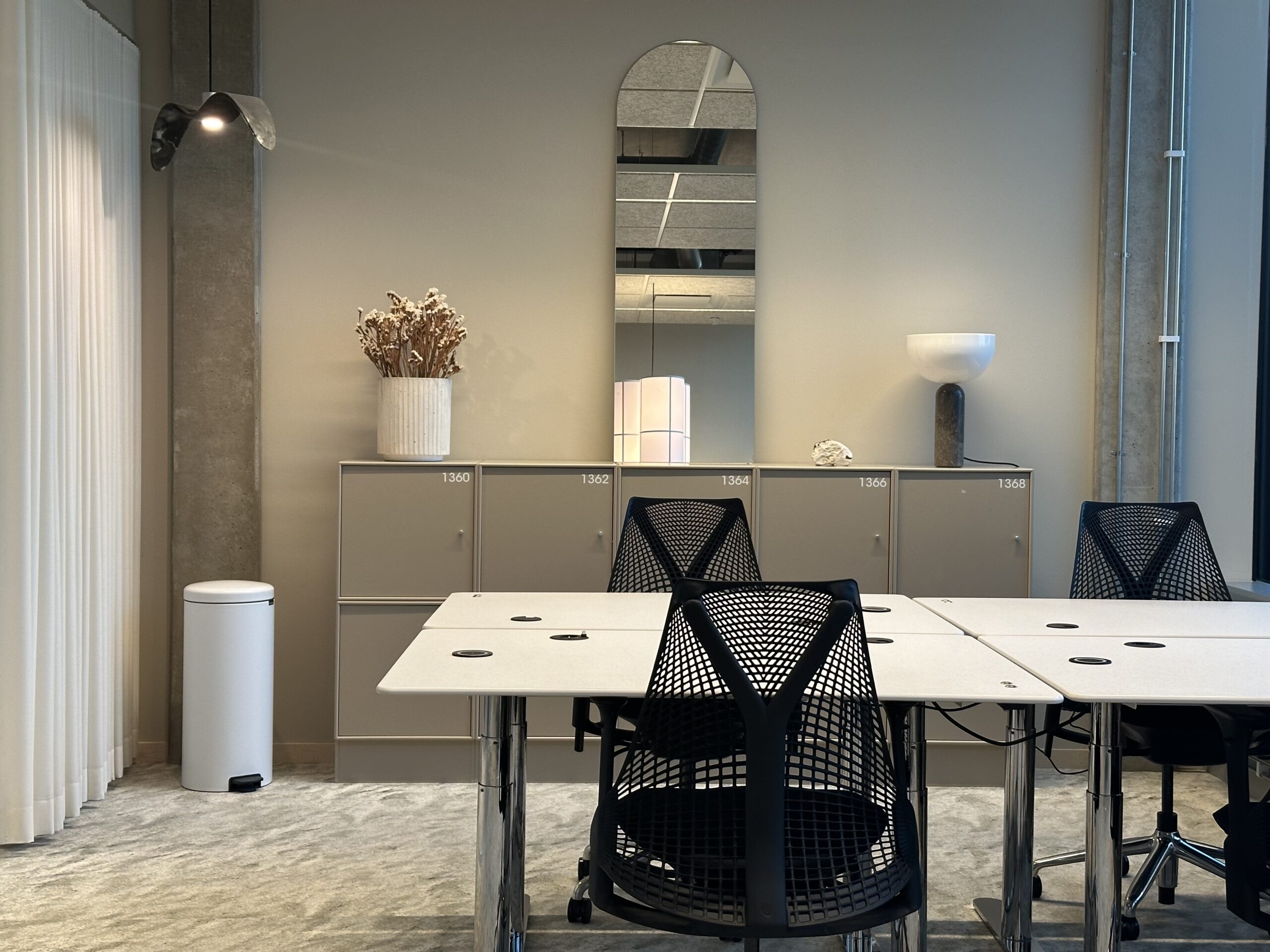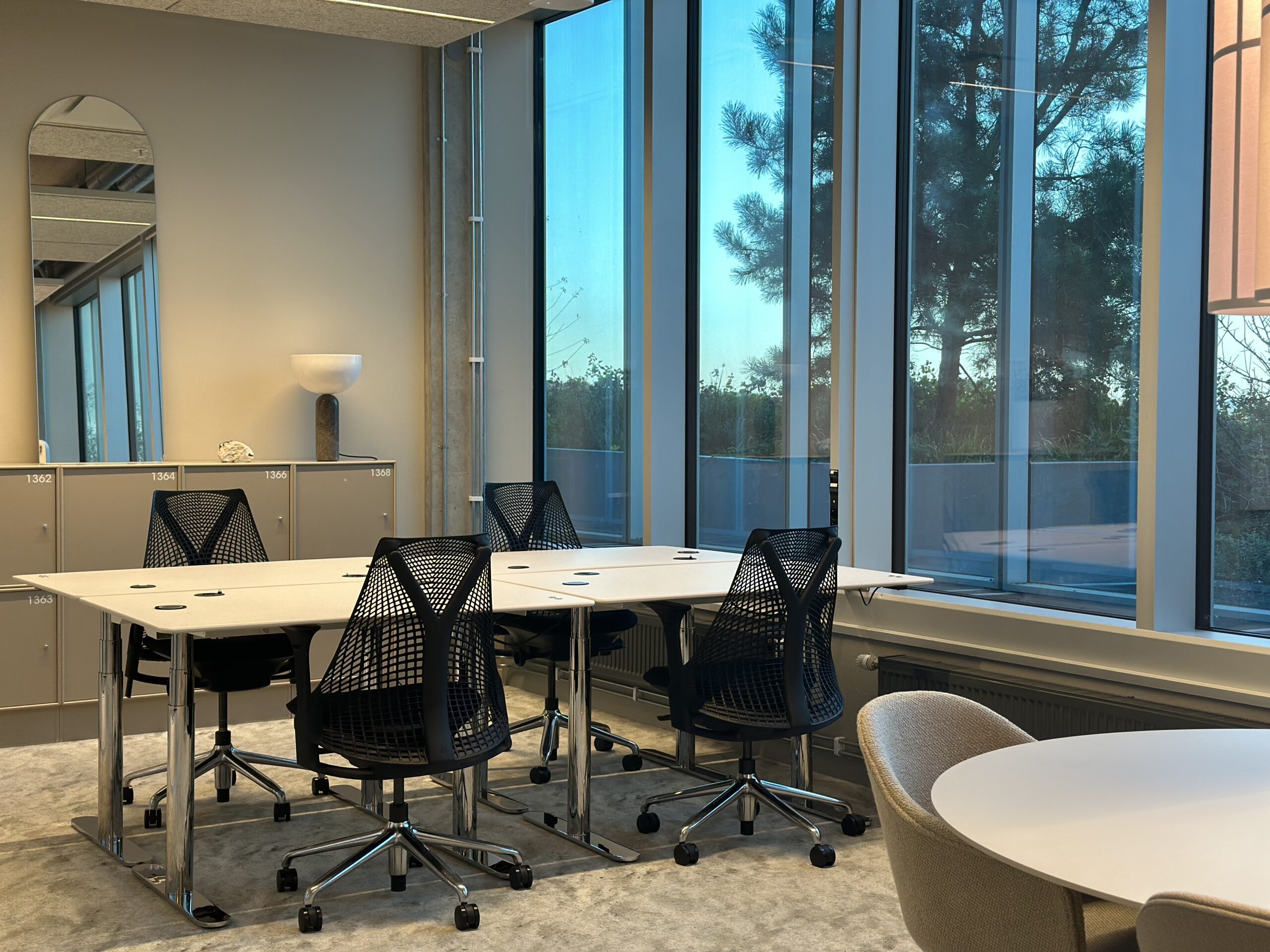 Rummet är fullt möblerat med fyra höj- och sänkbara skrivbord, ergonomiska stolar, låsbara skåp samt en egen mötesyta med tv-skärm. Det erbjuder en smidig arbetsvardag och har ett attraktivt läge nära coworkingytor, lounge och bokningsbara mötesrum. Här kombineras funktionalitet med en stilren och professionell känsla.