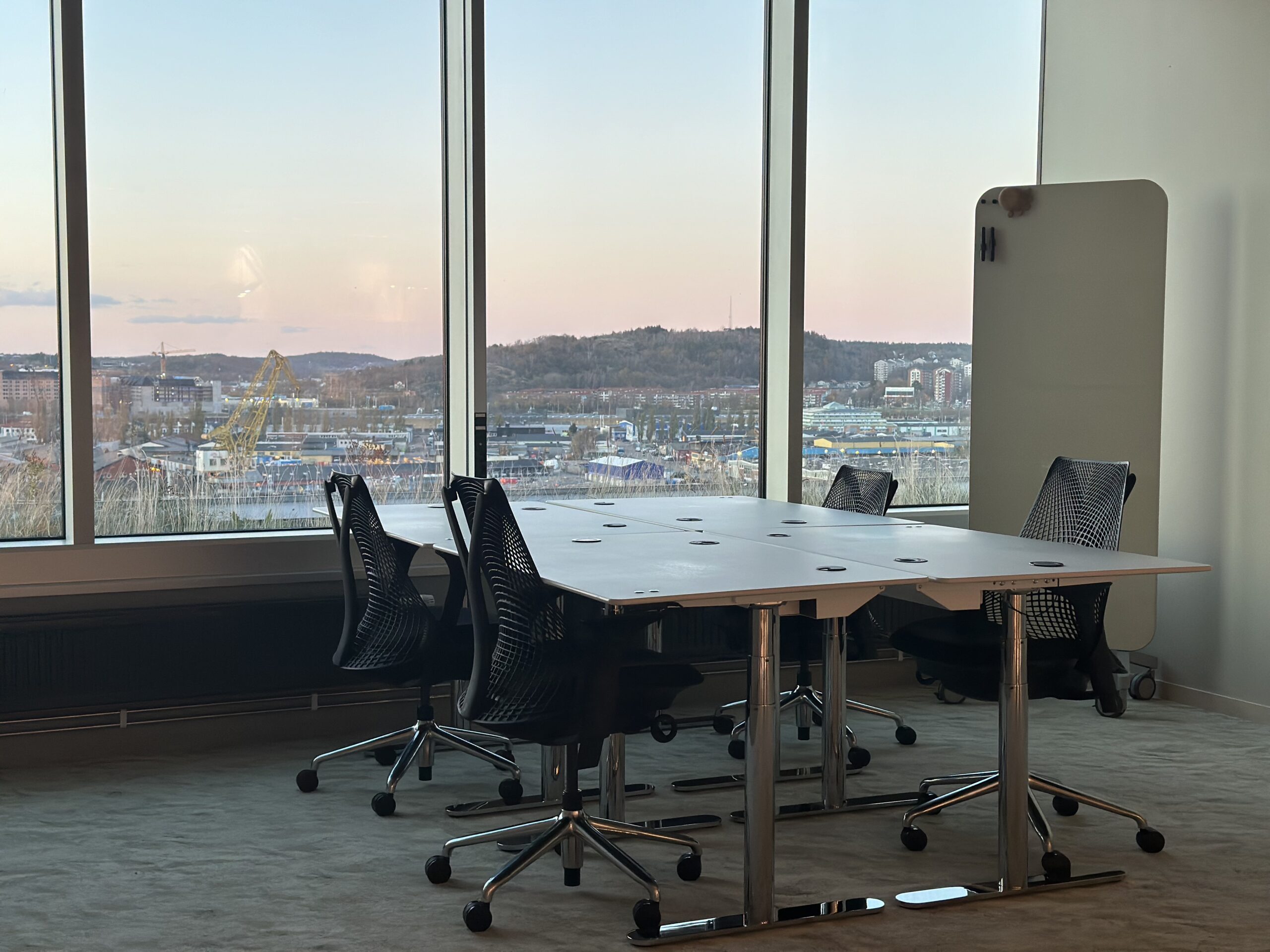 Kontor 5 erbjuder en välbalanserad arbetsmiljö med utsikt över stadens rörelse och Göta älv. Rummet präglas av en modern och inbjudande känsla som gör arbetsdagen både effektiv och trivsam.