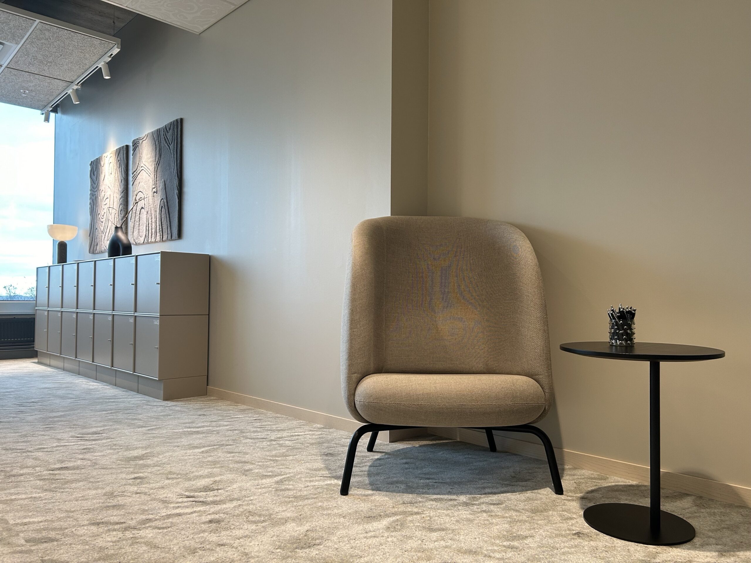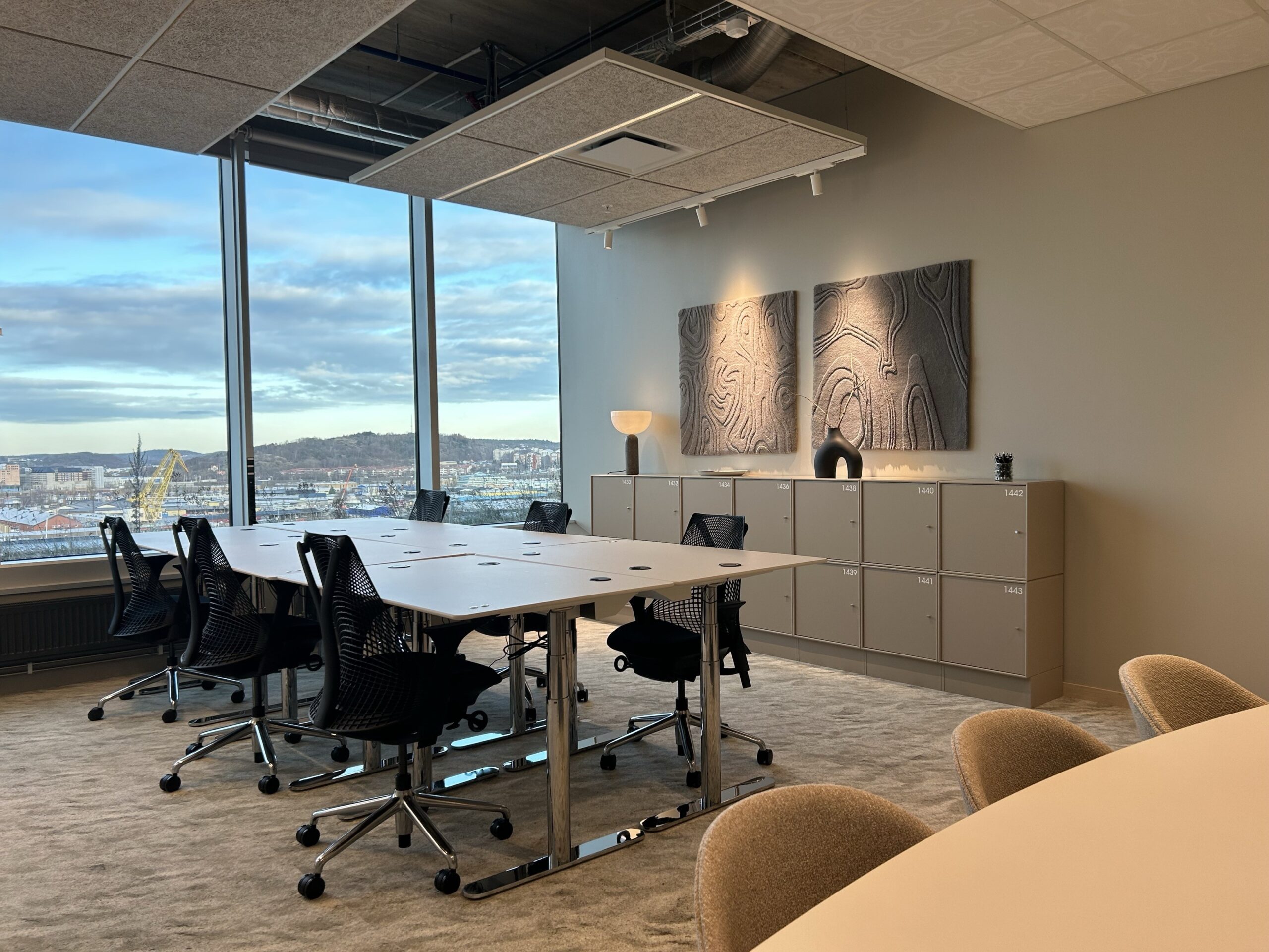 Rummet är fullt möblerat med sex höj- och sänkbara skrivbord, ergonomiska stolar, låsbara skåp samt en egen mötesyta med tv-skärm. Det ligger nära Arenas gemensamma ytor, vilket gör det enkelt att kombinera fokuserat arbete med möten och sociala inslag.