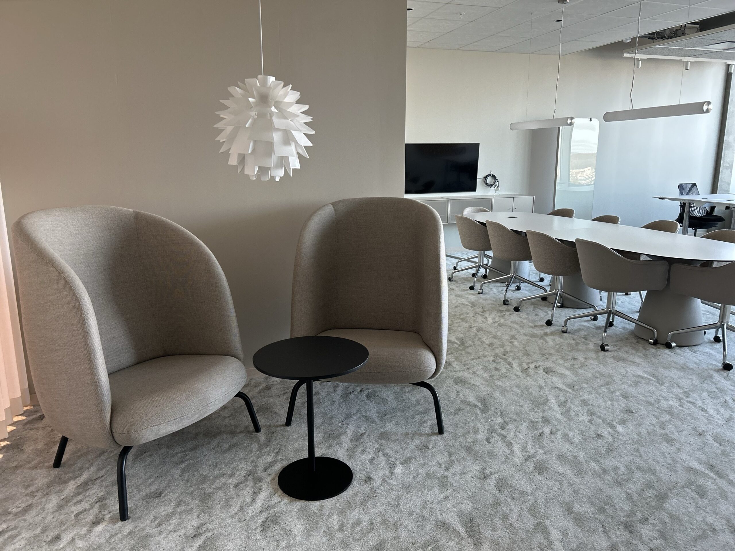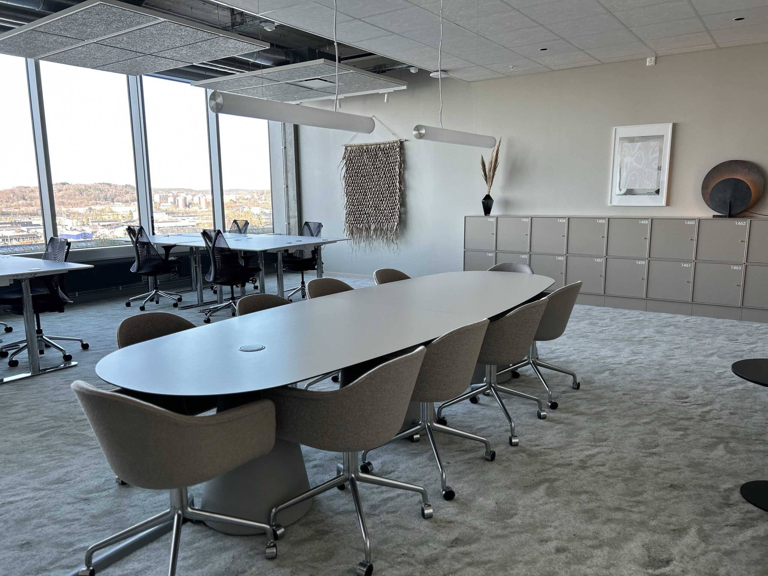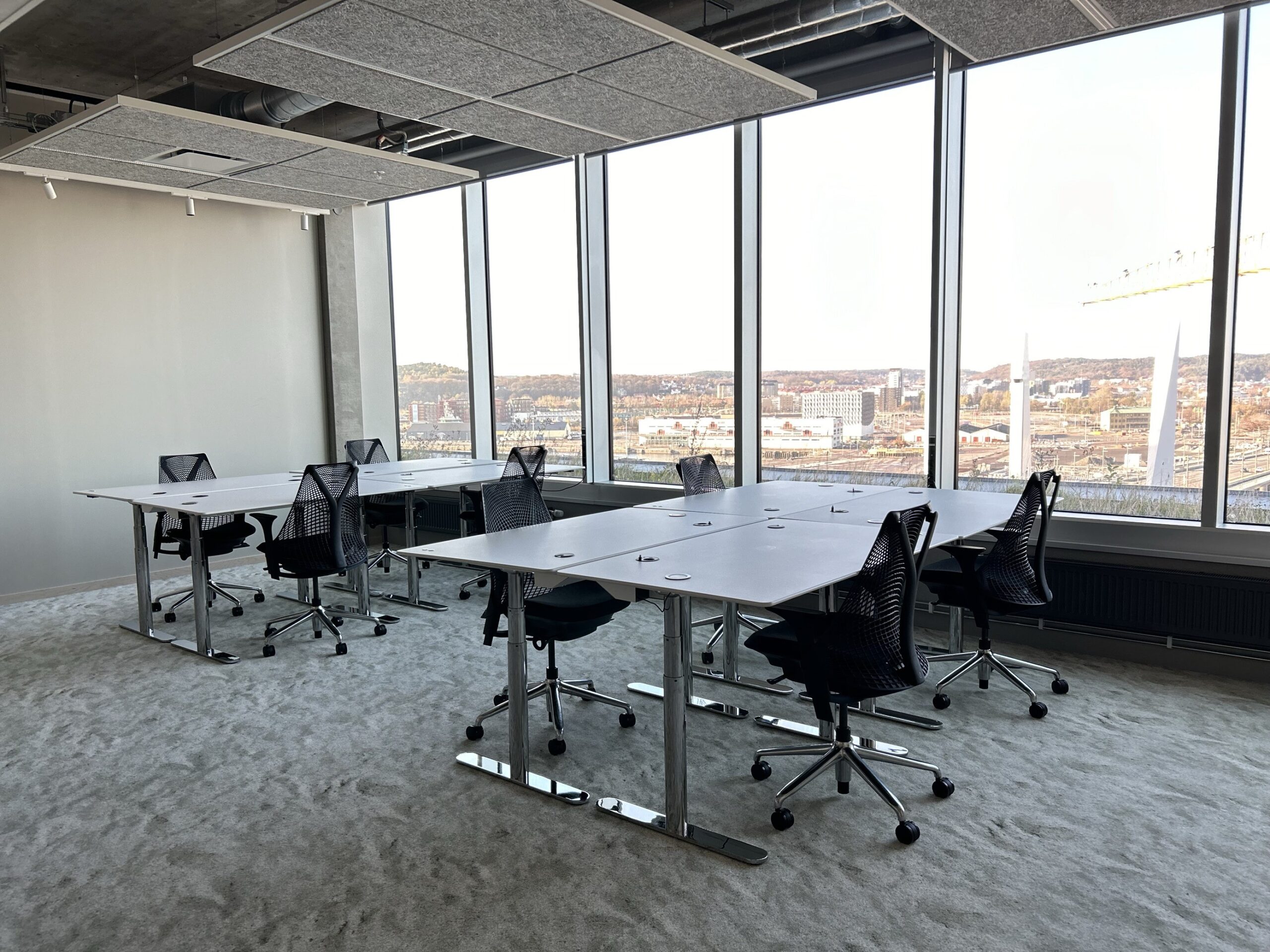 Rummet är fullt möblerat med åtta höj- och sänkbara skrivbord, ergonomiska stolar, låsbara skåp samt en egen mötesyta med tv-skärm. Det har ett attraktivt läge nära coworkingytor, lounge och bokningsbara mötesrum. Ett kontor som kombinerar komfort, funktion och flexibilitet.