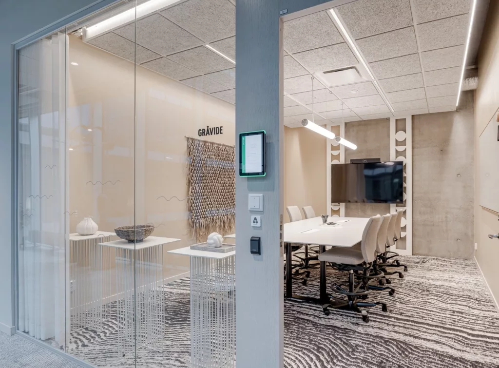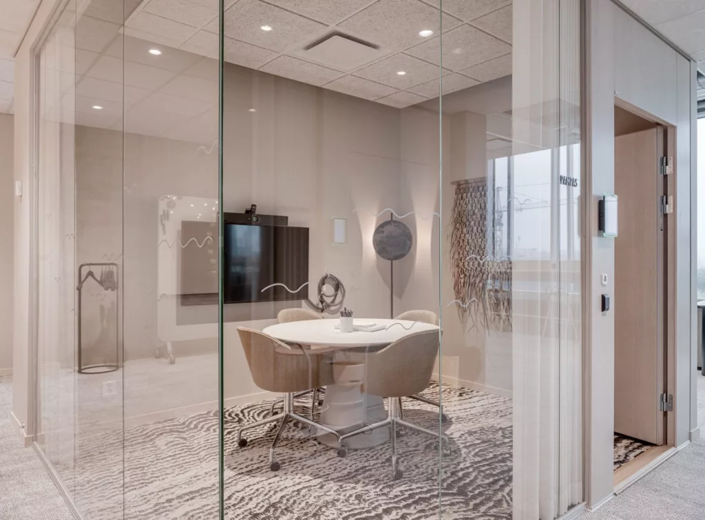 I mötesrum Strå möts ni i en lugn och trivsam miljö med soffa och fåtöljer. Perfekt för mindre möten, digitala samtal eller kreativa diskussioner i avslappnad stil.