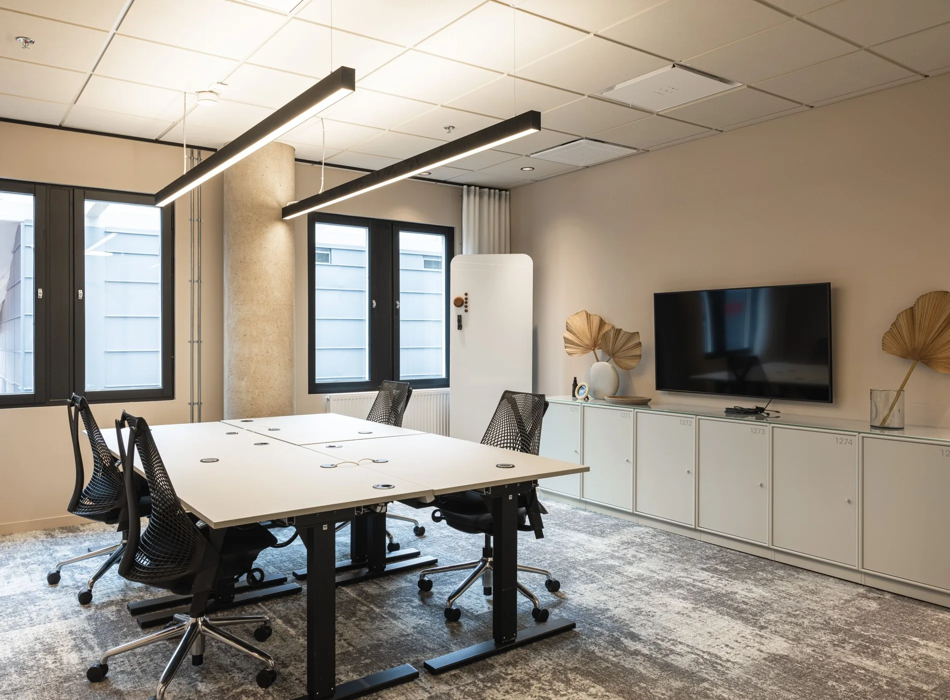 Välkommen till ett ombonat kontorsrum på tredje våningen med utsikt över Triangelns shoppingstråk. Här får du en arbetsmiljö som kombinerar stil och funktion, med fyra höj- och sänkbara skrivbord, ergonomiska stolar för bästa komfort och en tv-skärm. Rummet är utrustat med låsbara skåp. Dessutom ligger det nära skrivare, bokningsbara mötesrum och ett gemensamt pentry. De stora fönsterpartierna vetter mot coworkingområdet och bidrar till en ljus och inspirerande atmosfär.