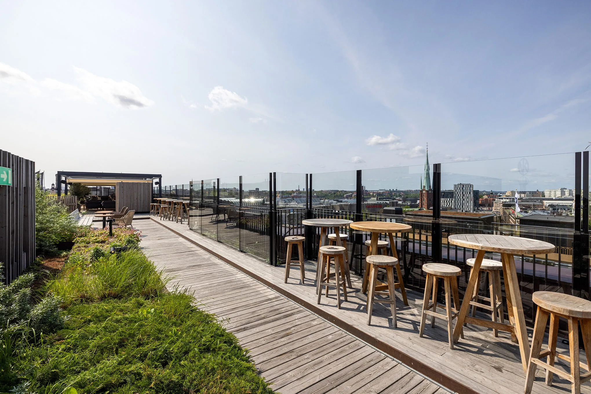 Här finns inte mindre än 150 flexarbetsplatser, 25 konferens- och mötesrum utrustade med smart teknik samt sju arenakontor för de som vill ha något eget. Därtill erbjuder vi fyra inspirerande lounger för arbete och spontana möten och en unik parkterrass på taket – perfekt för en kaffe i solen, kreativa pauser eller ett stärkande träningspass.