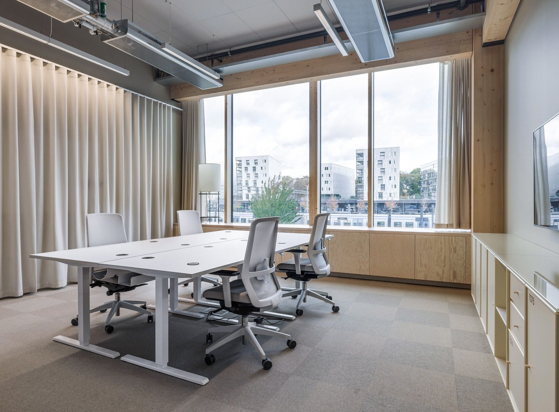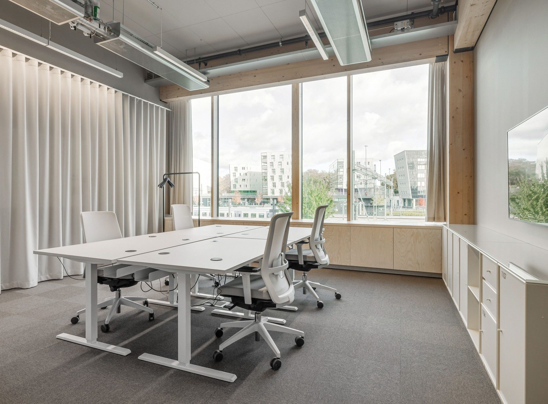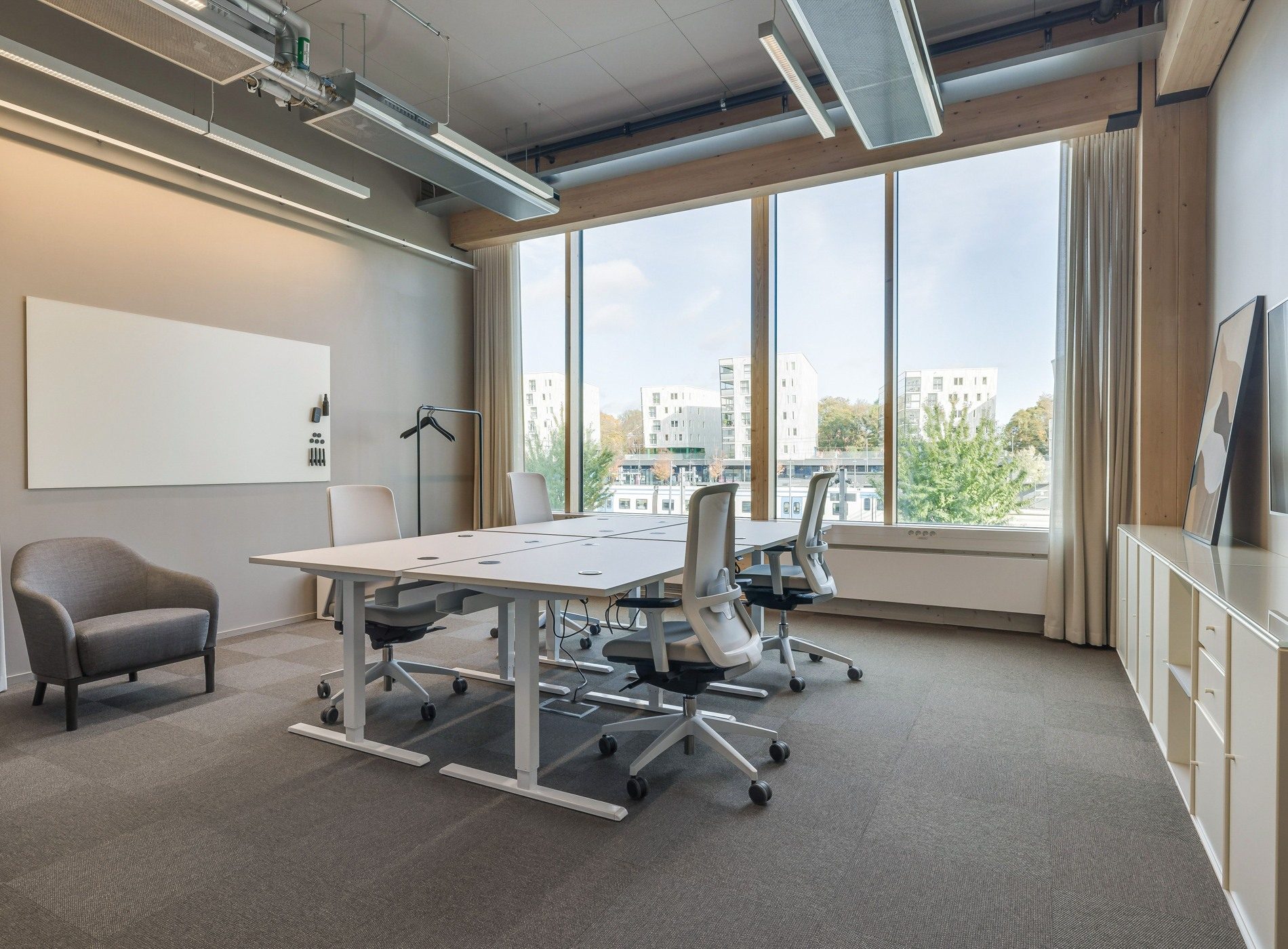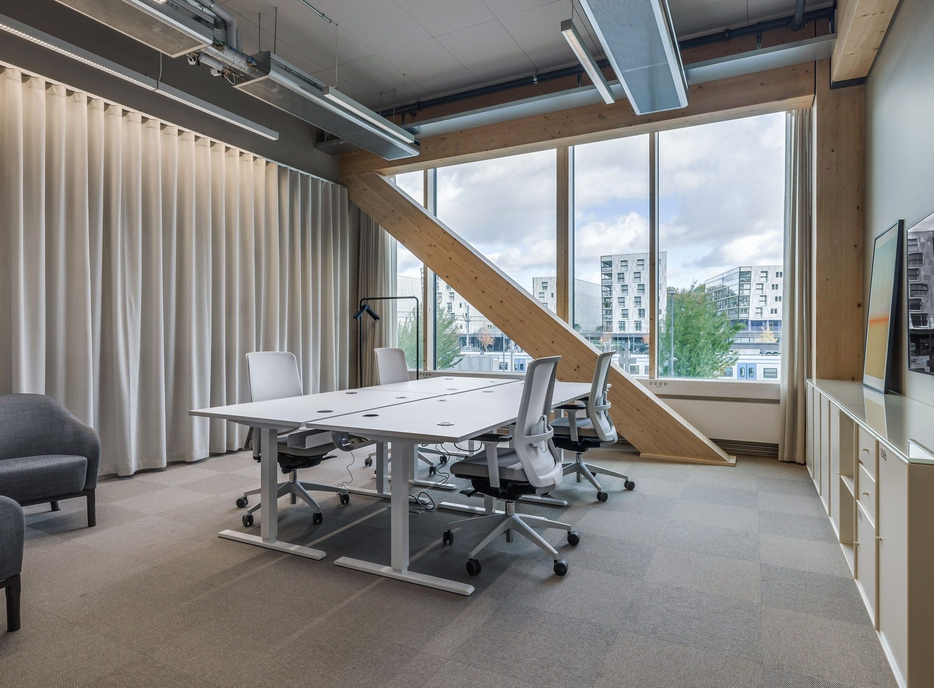 4 ergonomiska skrivbord med kontorsstol, 2 fåtöljer, låsbara skåp, sekretessgardin.