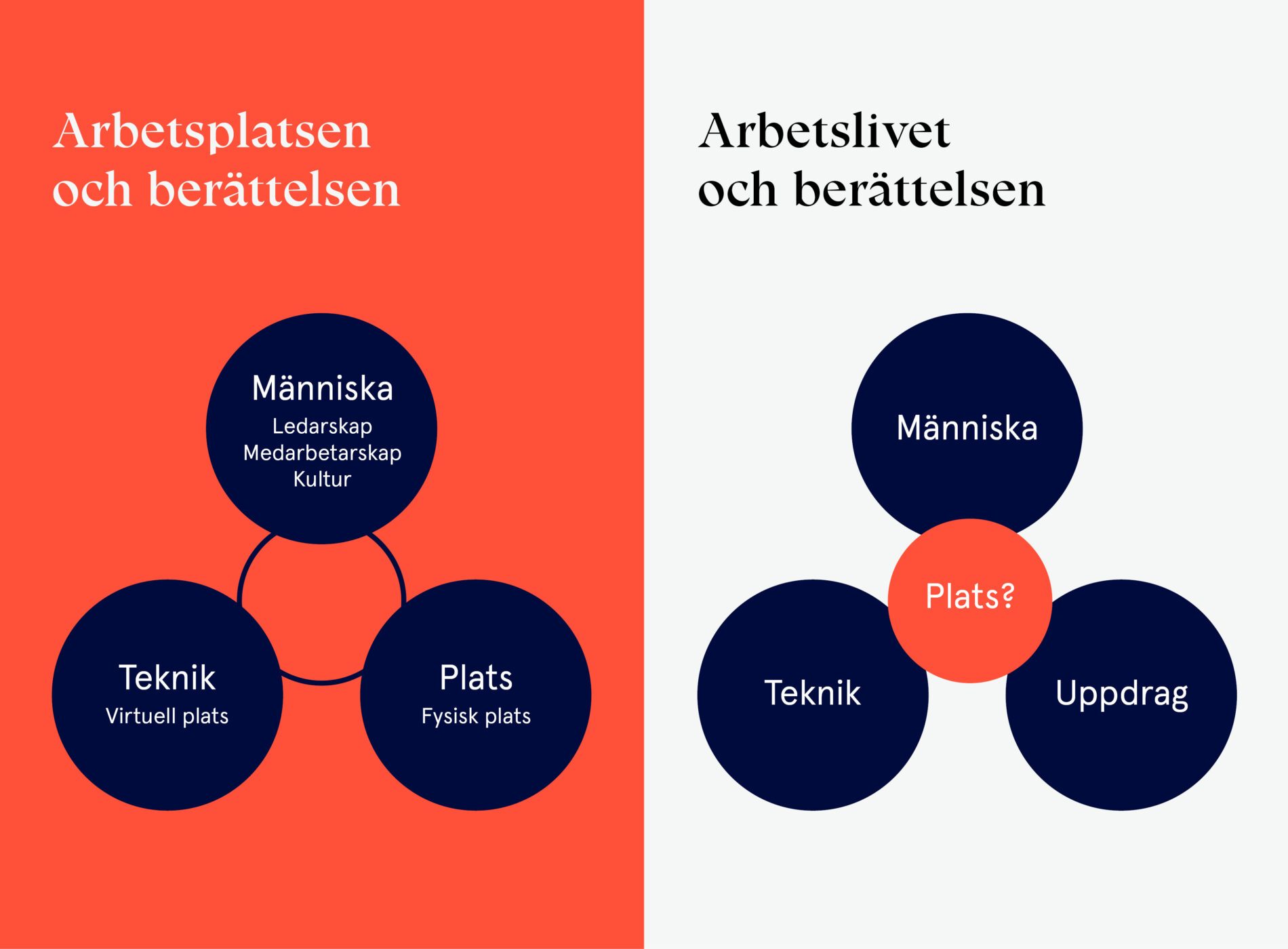 Många arbetsplatsstrategier fokuserar på att koppla samman människan, platsen och tekniken, där alla delar är lika viktiga för att upplevelsen ska bli den bästa. Vi ser nu att frågan om vilket uppdrag som företaget och de anställda har växer i betydelse och att platsen inte är konstant utan snarare en följd av de andra tre. Det finns ingen “One size fits all”. Varje företag jobbar olika med detta och alla måste hitta vad som är rätt för dem, deras behov och vad de vill åstadkomma. Allt fler företagsledare funderar på om platsen verkligen är det centrala. Är det kanske snarare uppdraget?