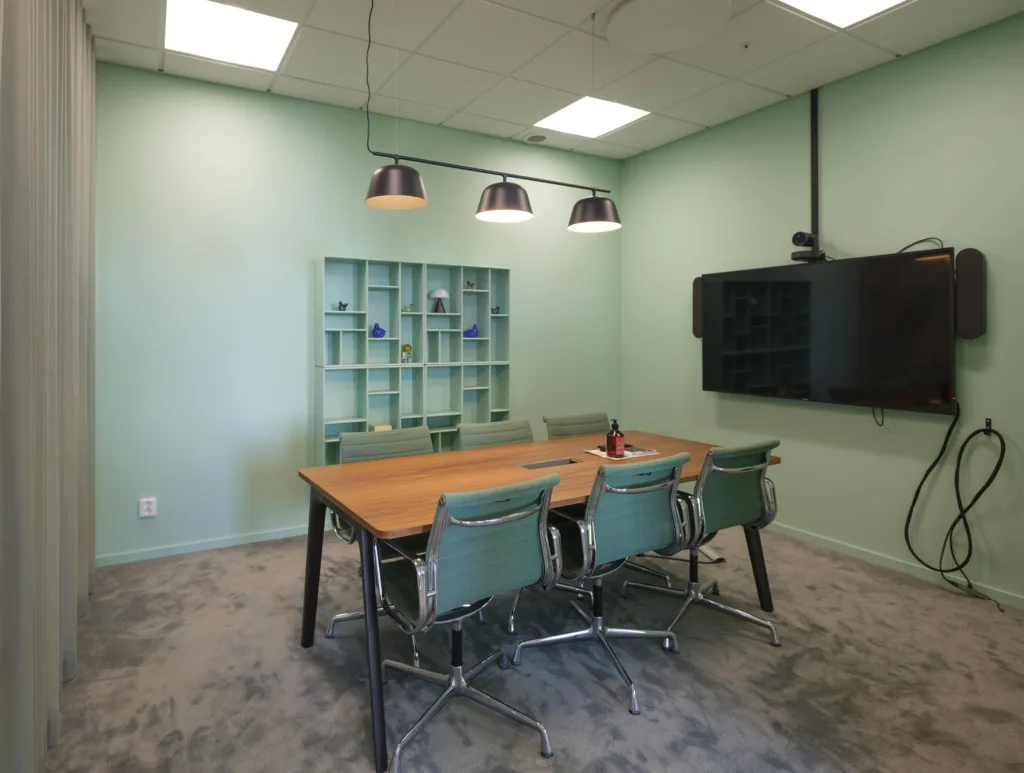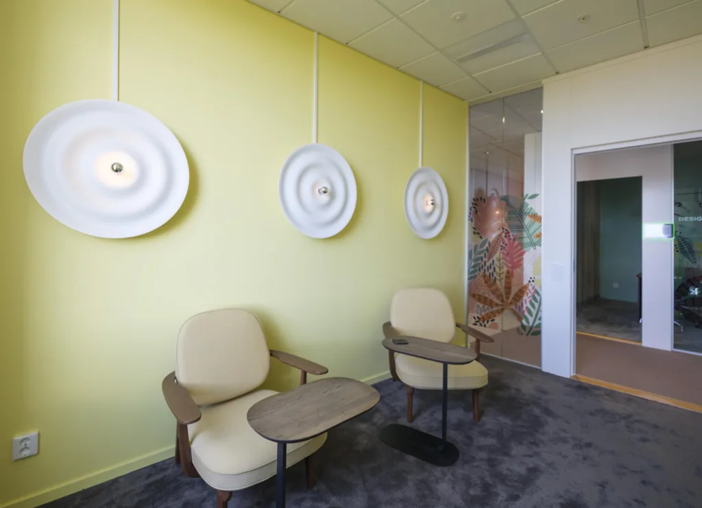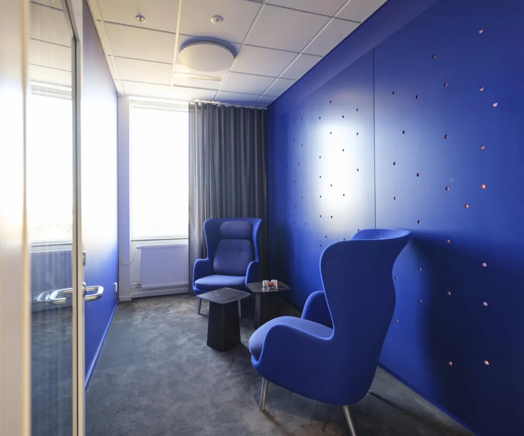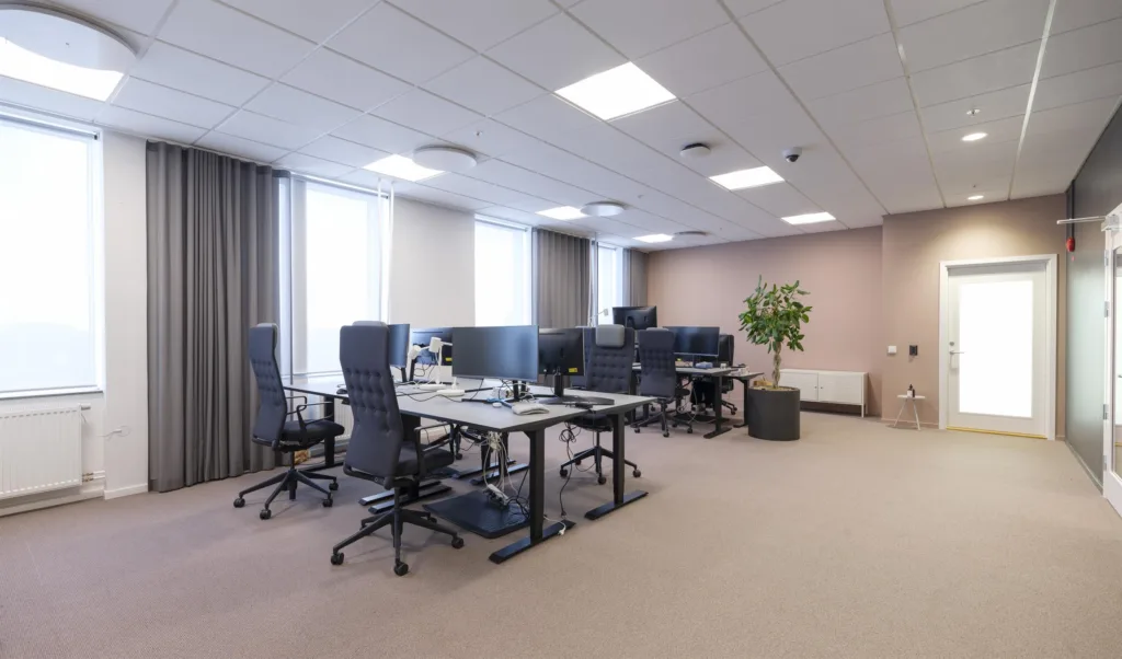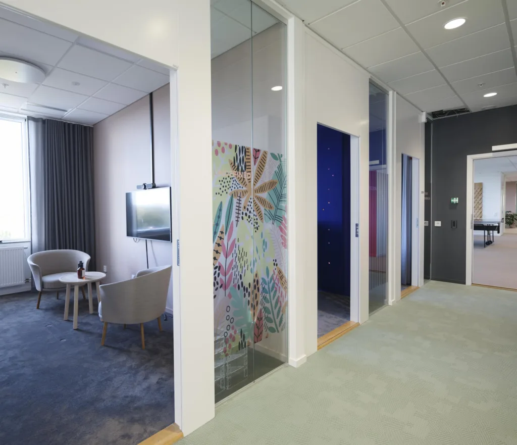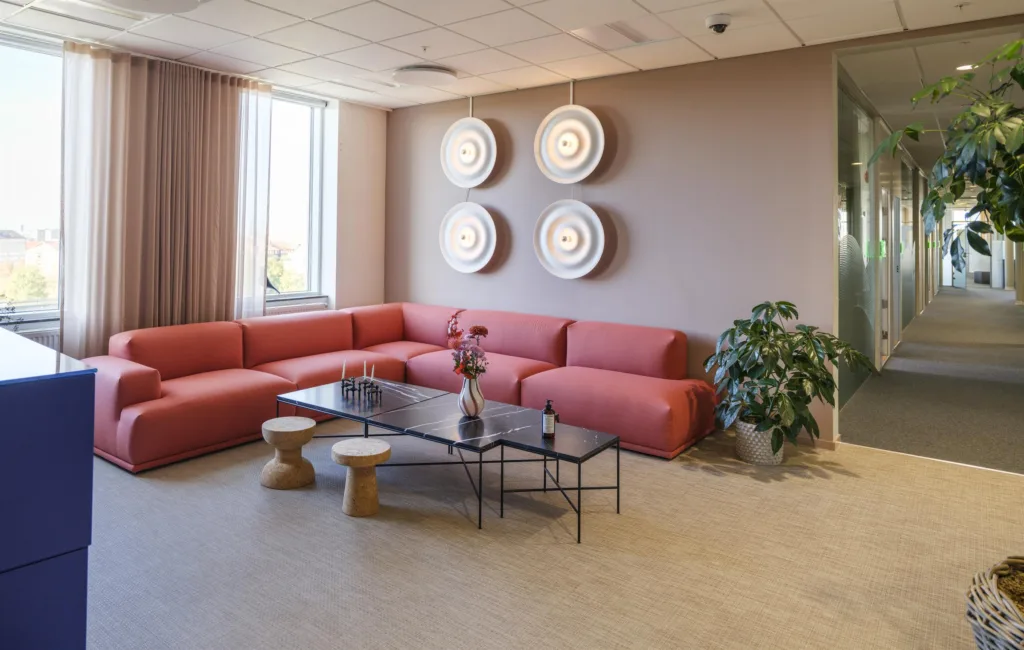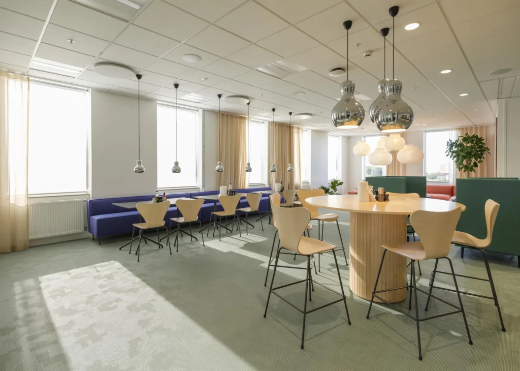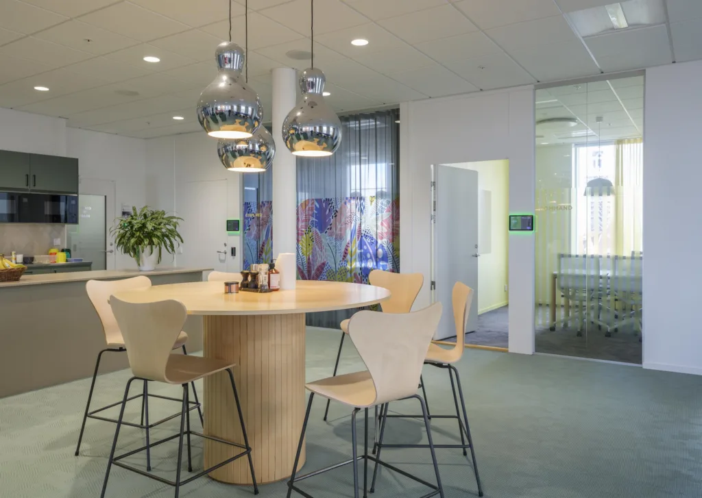 Planlösningen på 496 kvadratmeter rymmer öppet kontorslandskap, flera mötesrum samt mindre samtals- och fokusrum – totalt med plats för cirka 40 arbetsplatser. Här finns gott om möjligheter att arbeta både självständigt och tillsammans med kollegor eller kunder. Sociala ytor som lounge och pentry skapar en naturlig plats för spontana möten, kreativa diskussioner och pauser med utsikt.