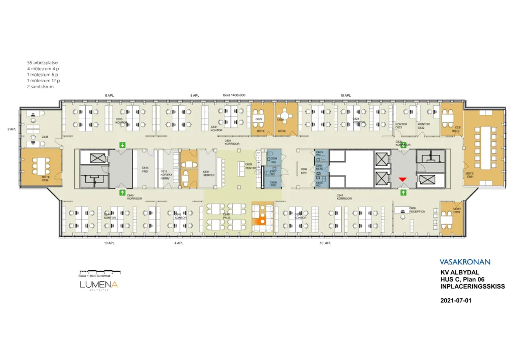 Detta är en suverän, dynamisk lokal om ett helplan om 820 kvm. Lokalen lämpar sig mycket väl i öppet landskap och aktivitetsbaserad lösning.