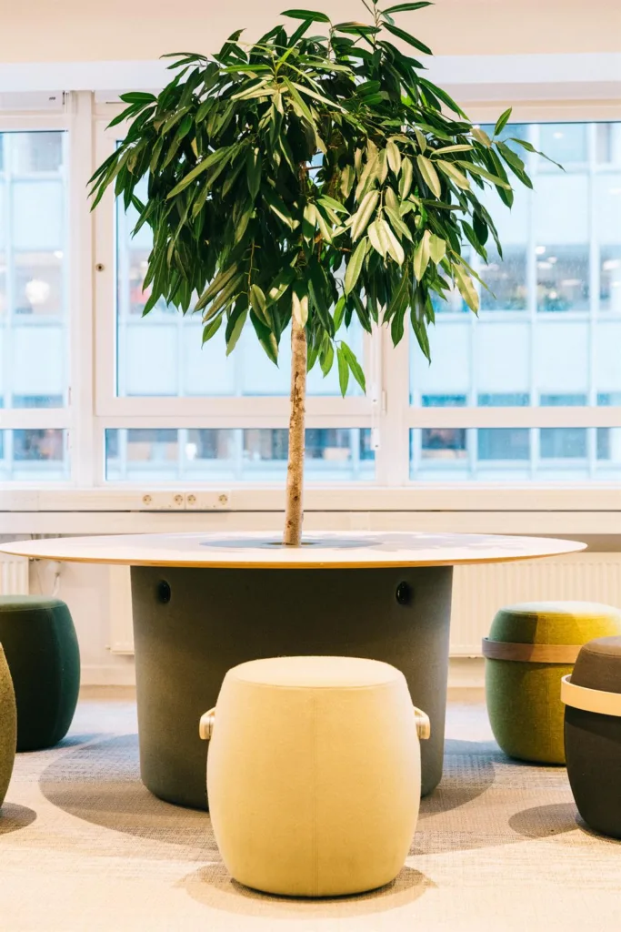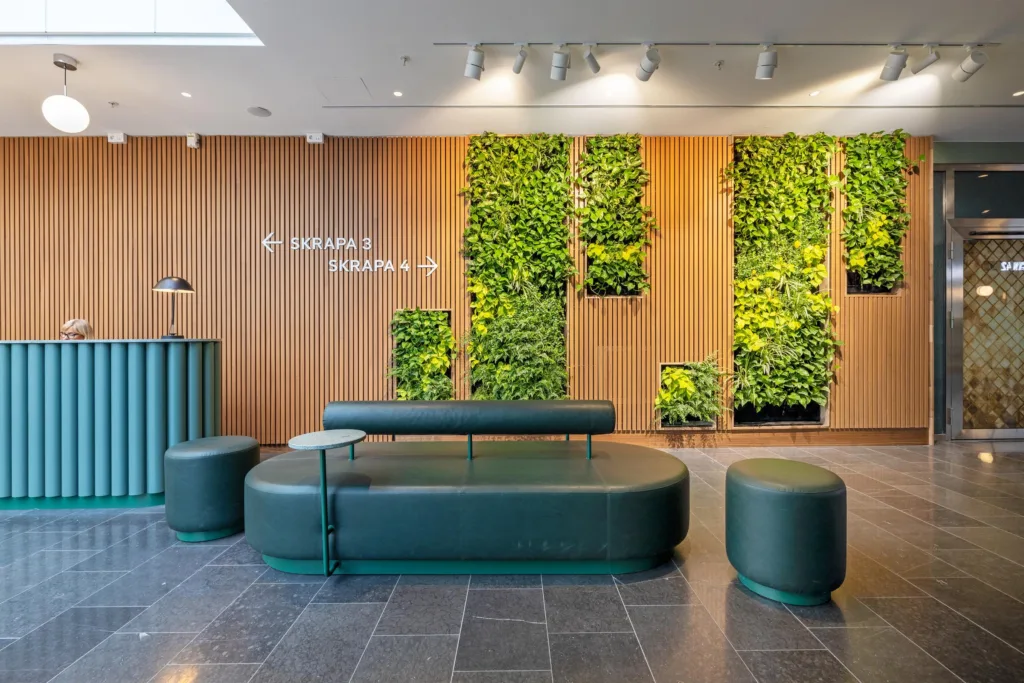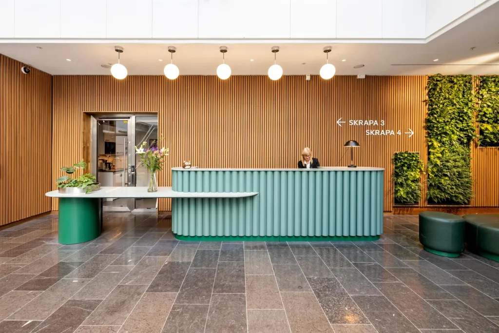 Förutom snygg och hållbar inredning har fastigheten vunnit miljöpriset Sweden Green Building Award 2021 och har högsta miljöcertifiering enligt LEED Platinum.