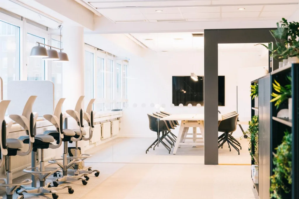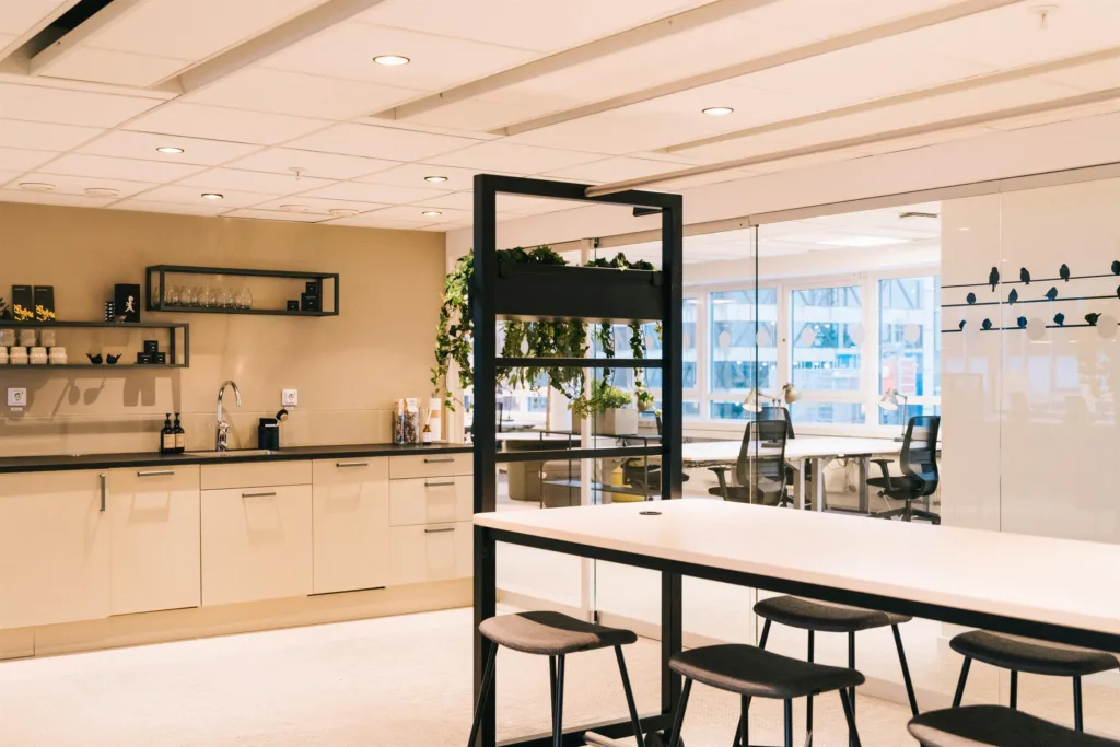 Den ljusa och öppna planlösningen sträcker sig över 550 kvadratmeter och skapar en känsla av öppenhet och samarbete. Här finns flexibla möjligheter för 44 arbetsplatser, mötesrum och öppna arbetsytor, samt det moderna och rymliga köket, perfekt för gemensamma måltider, kreativa pauser och spontana möten.