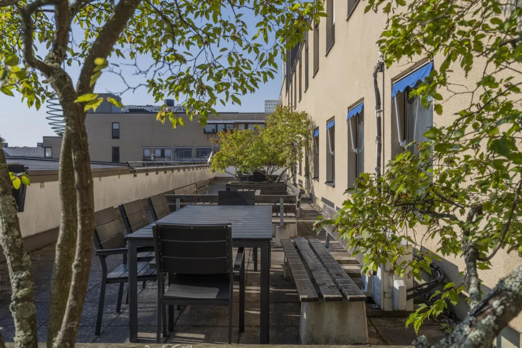 Vill du ta en kaffe utomhus kan du enkelt gå ut till den gemensamma soliga terrassen som nås via trapphuset.