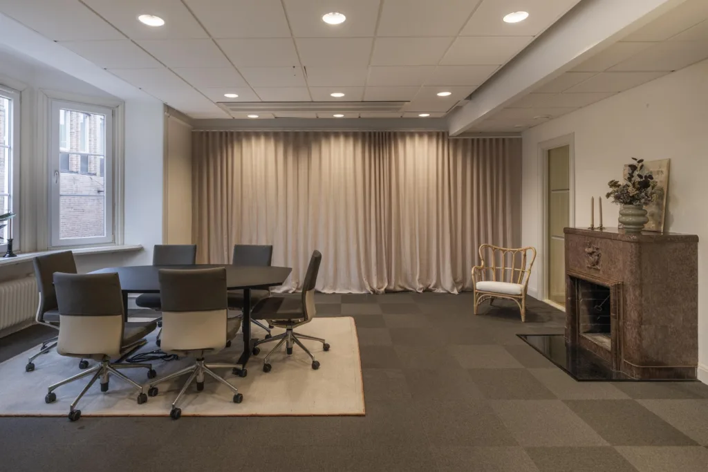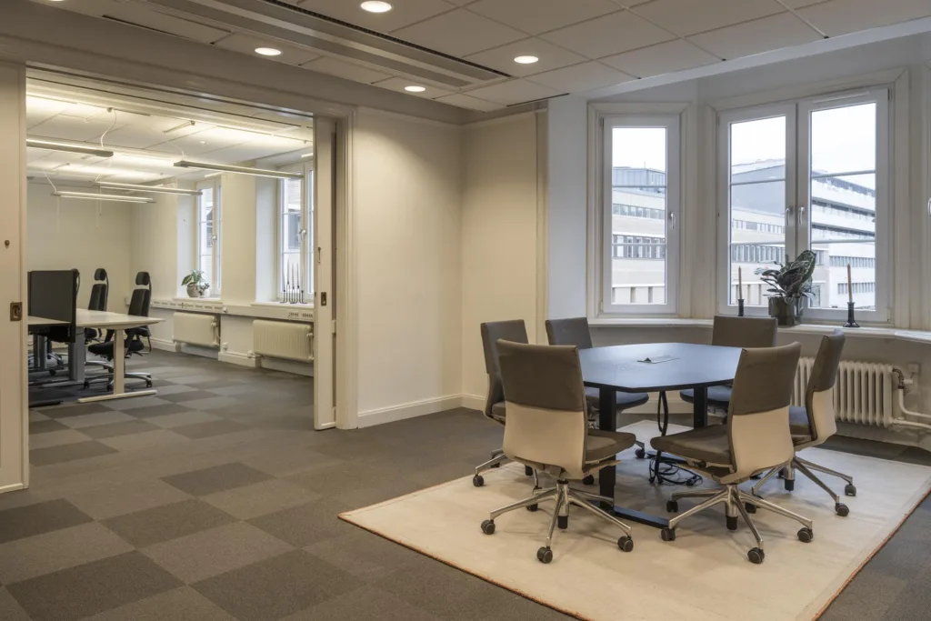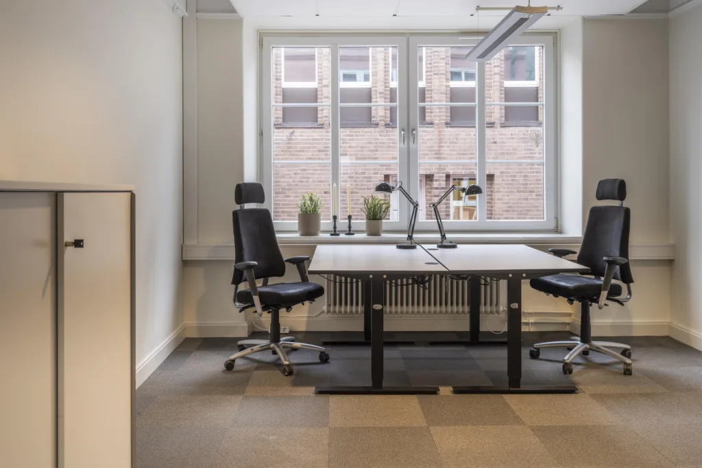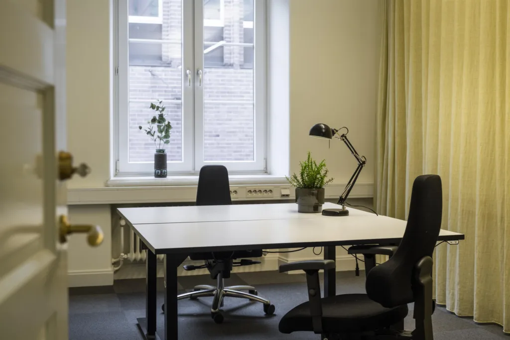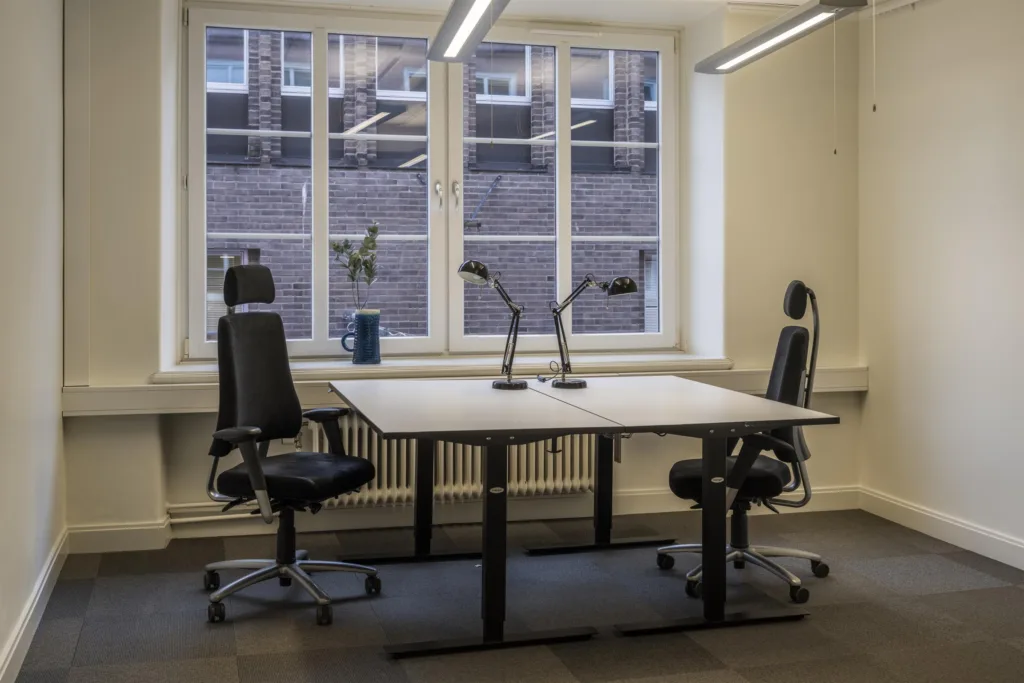 Kontoret som sträcker sig över 179 kvm är omsorgsfullt utformat för att passa både företag som föredrar öppna arbetsytor och de som behöver mindre kontorsrum. Här finns fem arbetsrum, ett pausrum med ett fullt utrustat pentry samt ett konferensrum med burspråk. Kontoret passar 10-12 arbetsplatser. För den som vill njuta av solen finns en liten balkong som vetter mot innergården.