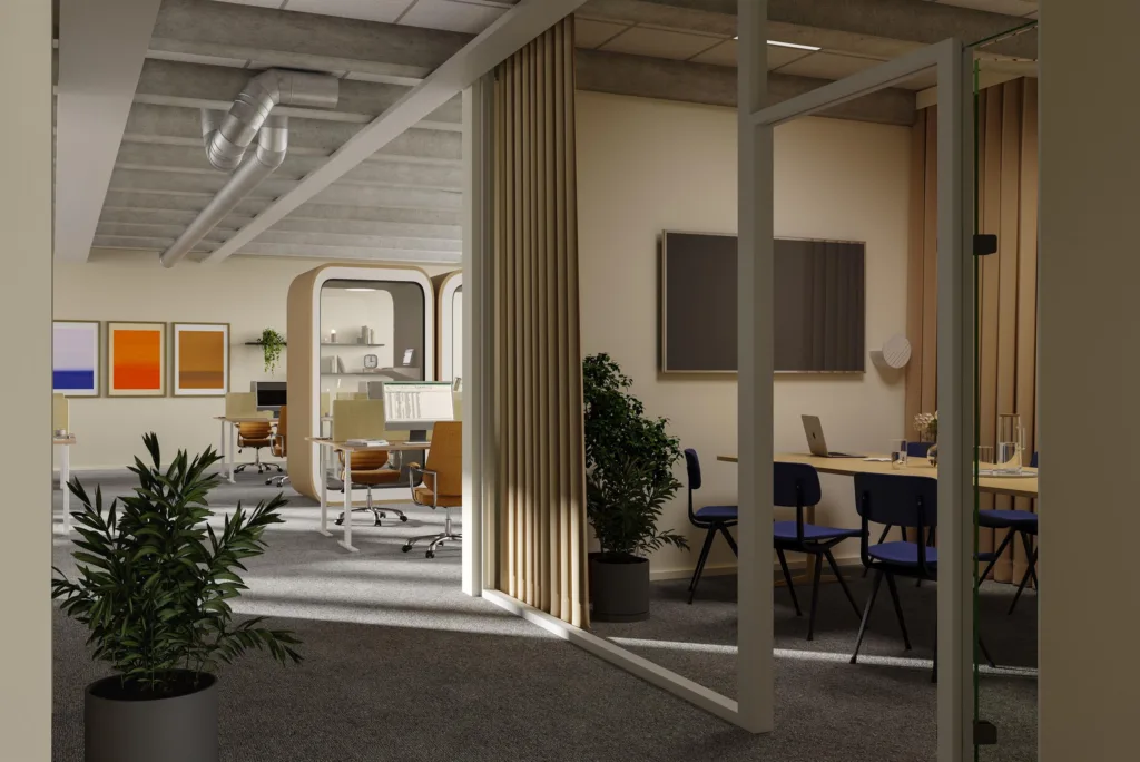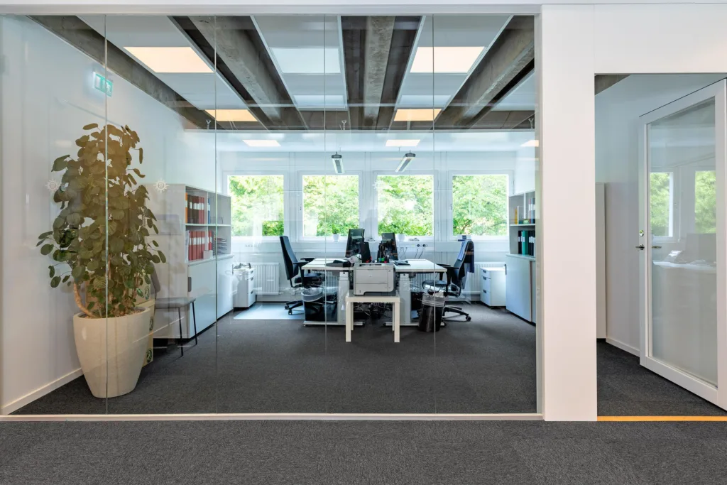 Planlösningen anpassas för en kombination av öppna ytor och mötesrum, så att ni kan jobba fokuserat, samlat eller i mindre team beroende på behov. De generösa fönstren ger ljus till hela lokalen och bidrar till en skön och öppen känsla. Det här är ett kontor där flödet fungerar – där ni enkelt rör er mellan fokuserat arbete, möten och sociala pauser.