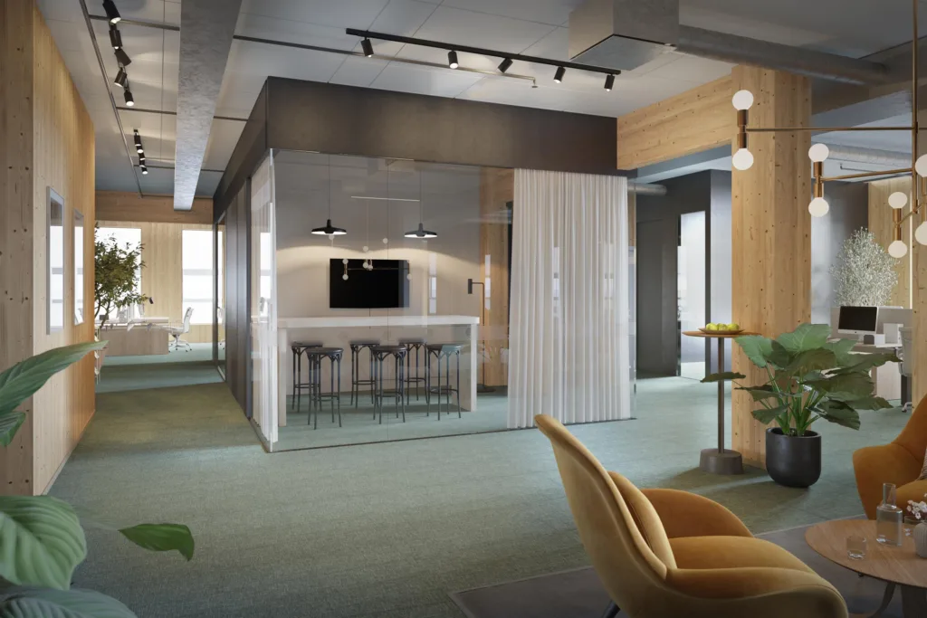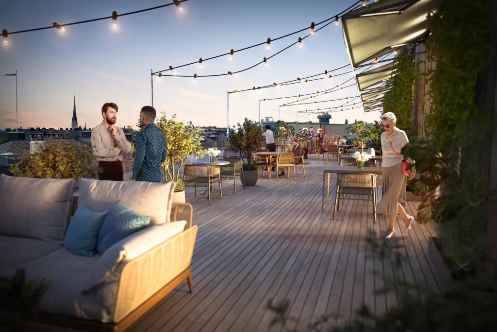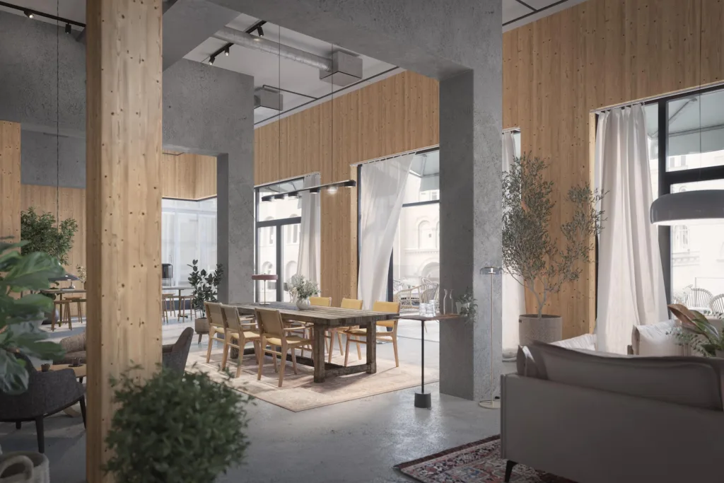 Elsa-Karin erbjuder ljusa, flexibla kontorsytor över fem plan med en imponerande restaurang med terrass högst upp. Här tar platsen arbetsmiljön till nya höjder, där ljuset och naturen spelar huvudrollen och träväggarna skapar en varm och inspirerande känsla. Det är en miljö där kreativiteten trivs och utvecklas från första stund.