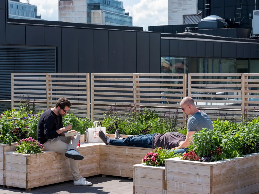 Här finns möjlighet att ta plats på någon av terrasserna för lunch eller kundevenemang, där den högst upp på taket bjuder på en slående vy över hela staden. Längre ner ligger terrassen där Bee Urban har anlagt en fantastisk stadsodling med grönska och närodlat mitt i stan. För den konstintresserade finns en unik konstsamling med över 40 stora konstverk och installationer.