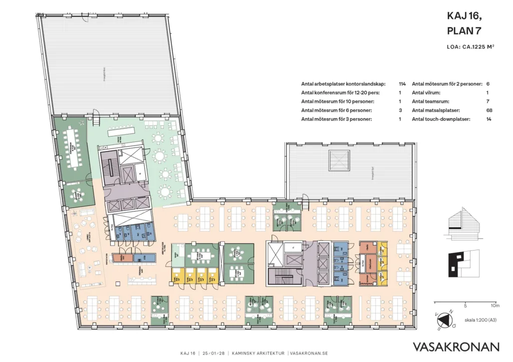 Lokalen erbjuder hela 12 mötesrum varav ett konferensrum med plats för upp till 20 personer. Därtill även flera teamsrum för digitala möten. Kontorslandskapet rymmer upp till 114 arbetsplatser med en storslagen utsikt vart man än vänder blicken. Det stora pentryt i anslutning till en av innergårdarna och loungeytan med utsikt över älven blir självklara samlingspunkter.