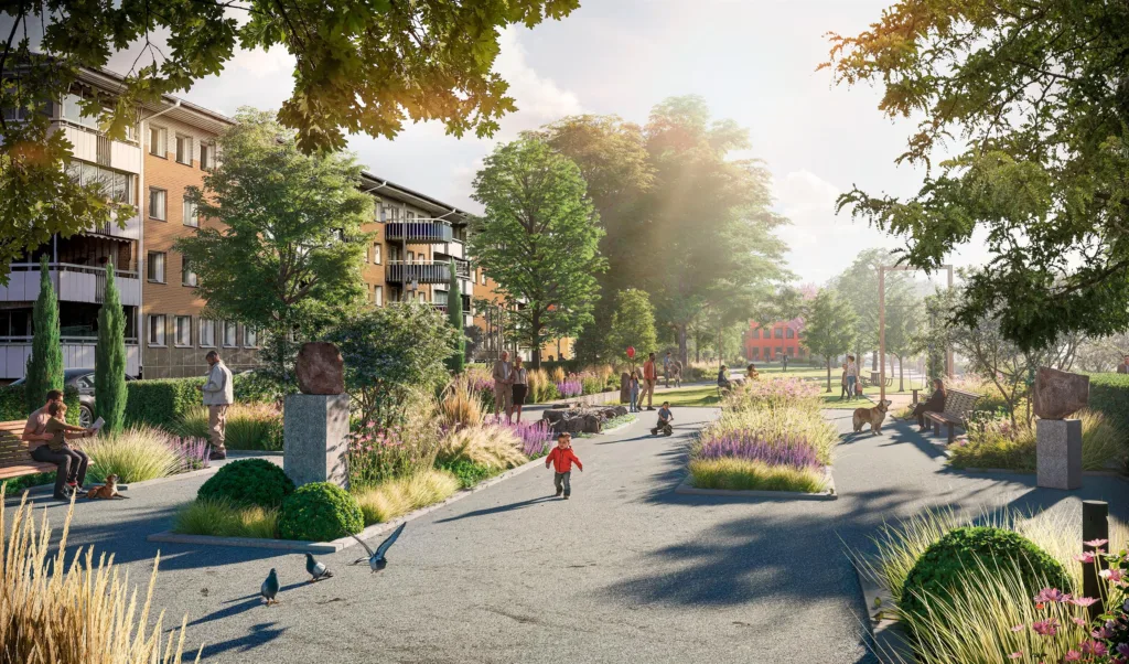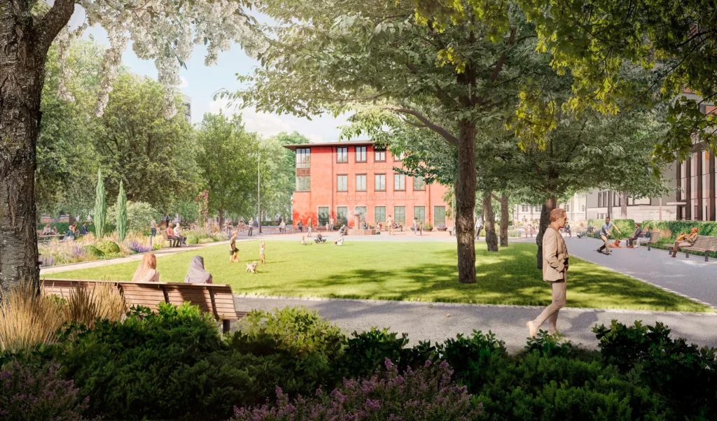 Det gröna stråket precis utanför dörren, den härliga takterrassen och serveringar som växer ut i det gröna stråket skapar en härligt miljö och gör att gränsen mellan ute och inne suddas ut.