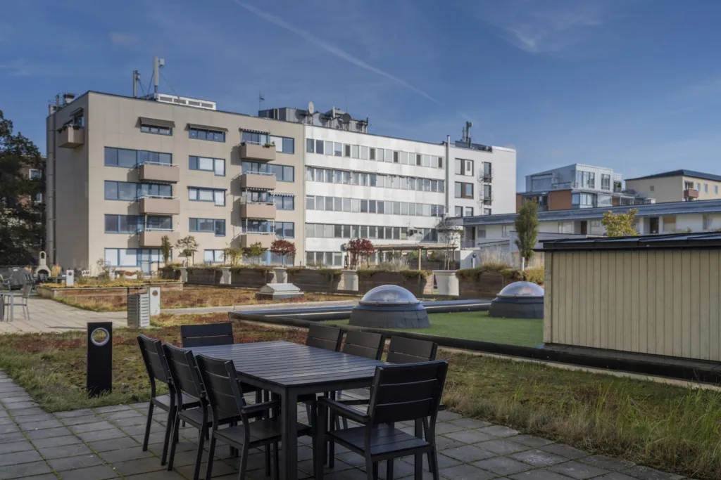 På våning tre finns en trevlig innergård med sittplatser och grönska för en lunch med kollegorna eller bara för att varva ner eller skapa nya kontakter med övriga hyresgäster.