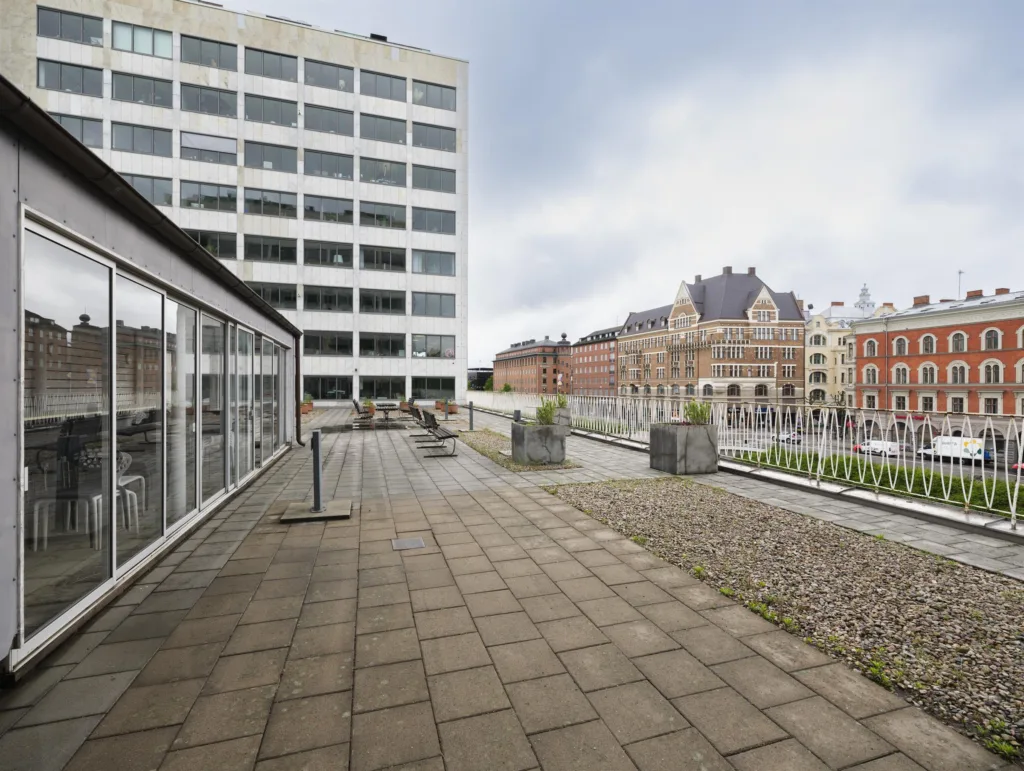Några våningar ner finns en fastighetsgemensam terrass – perfekt för en kopp kaffe, ett samtal i solen eller en lugn paus mitt i arbetsdagen. Lokalen är moderniserad med omsorg om både estetik och funktion, och det finns cykelparkering samt möjlighet att hyra garageplats i huset.