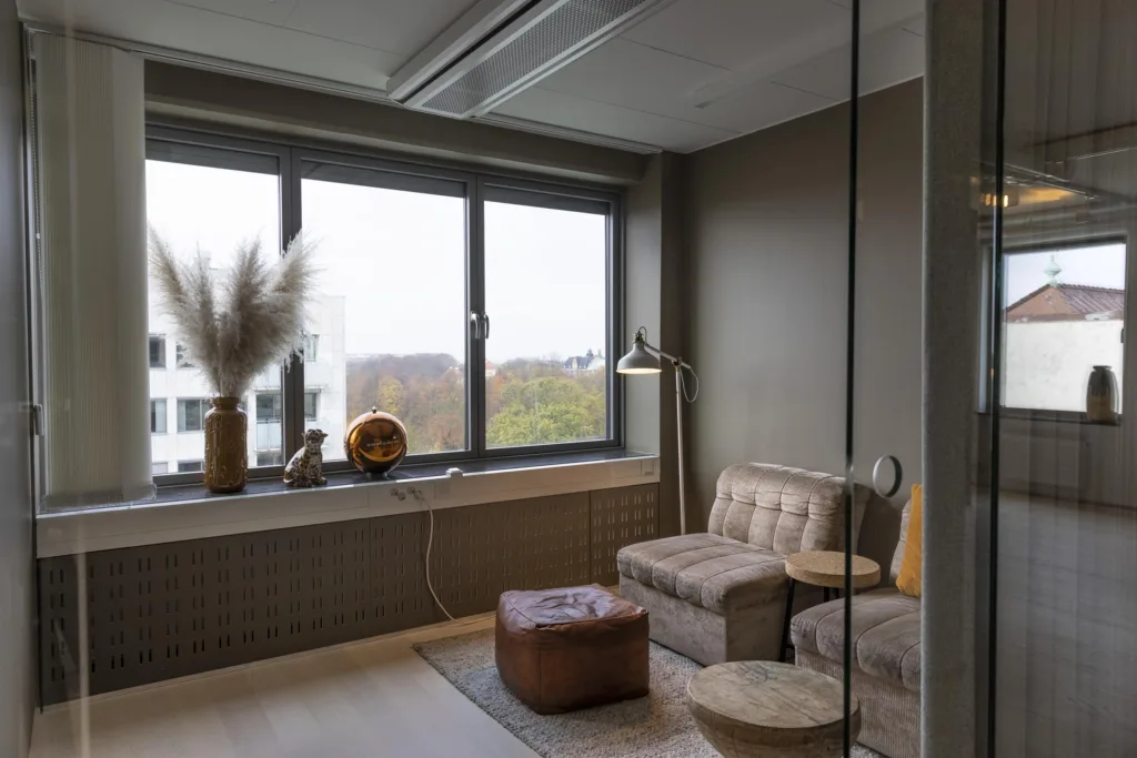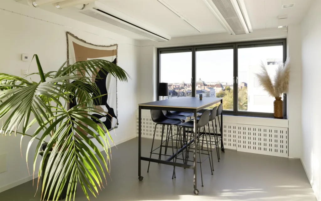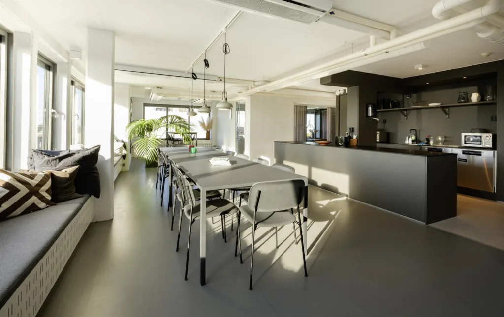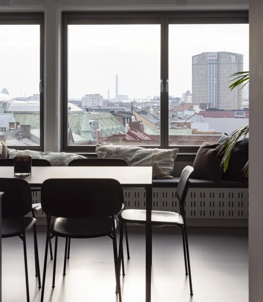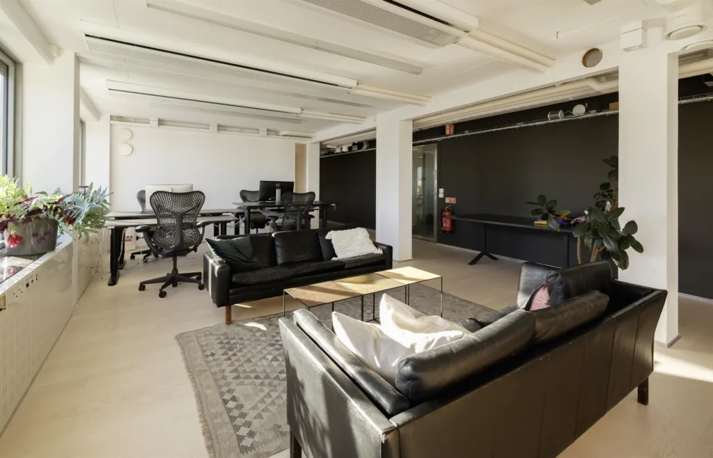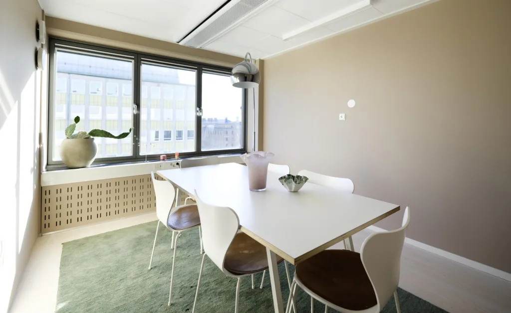Några våningar ner i huset finns dessutom en gemensam terrass – perfekt för kaffe, paus eller ett möte i solen.