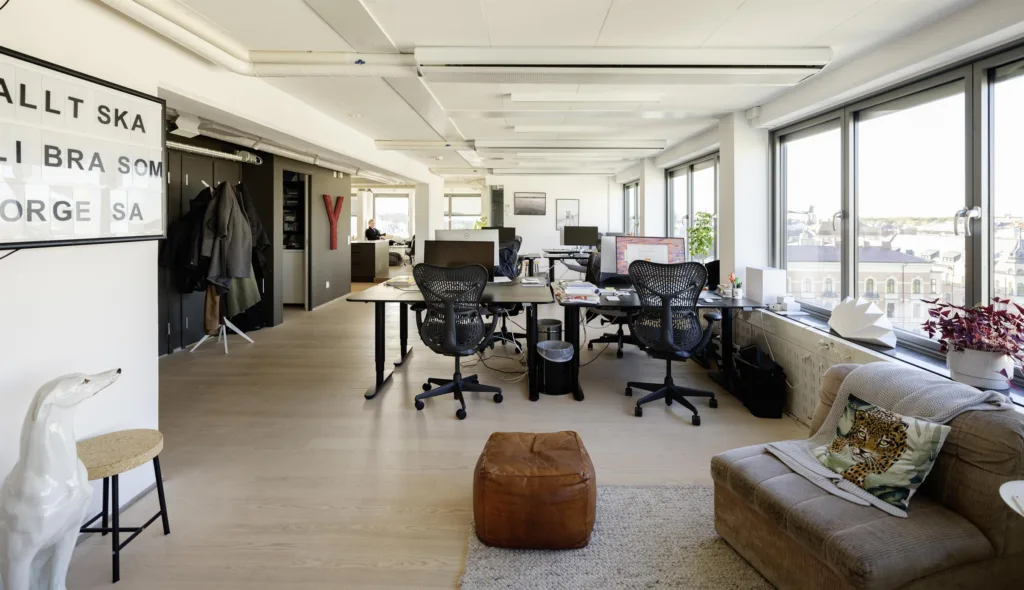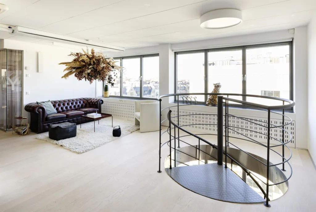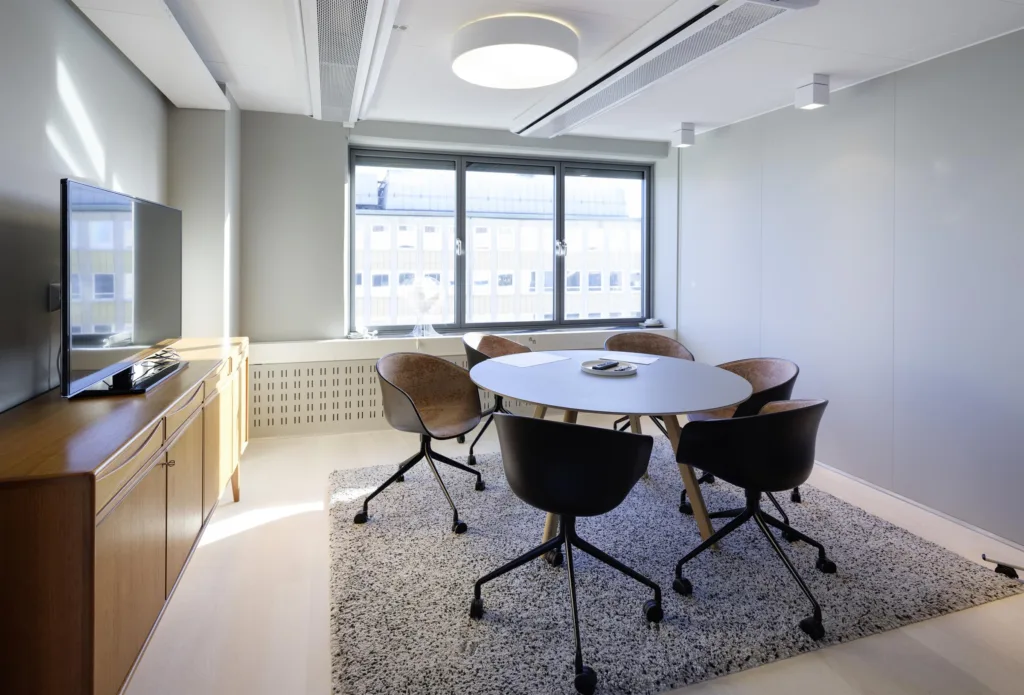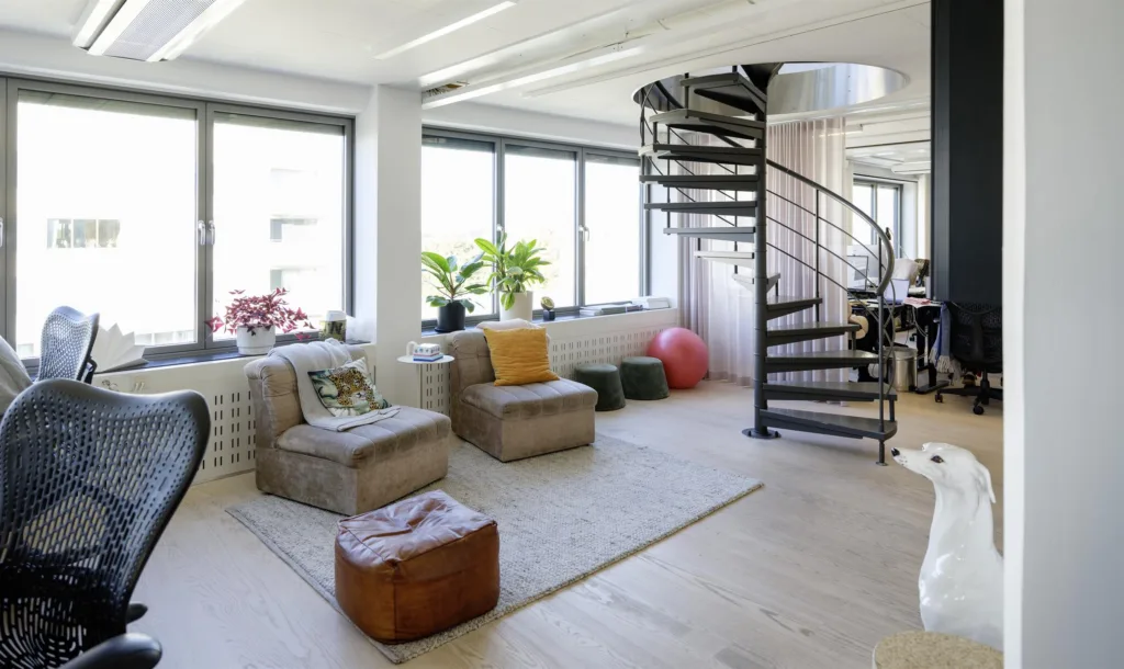 Här får du ett fritt läge med utsikt i flera väderstreck. De många fönstren ger dagsljus till alla arbetsplatser, och planlösningen – med rymliga ytor, tydliga arbetszoner och mötesrum nära till hands – gör det enkelt att arbeta både fokuserat och tillsammans. Den öppna strukturen ger bra överblick och naturlig kontakt mellan ytorna, och spiraltrappan knyter ihop de två planen på ett smidigt och modernt sätt. Redan när man kliver in på morgonen märks ljuset och den luftiga känslan som präglar hela lokalen.
