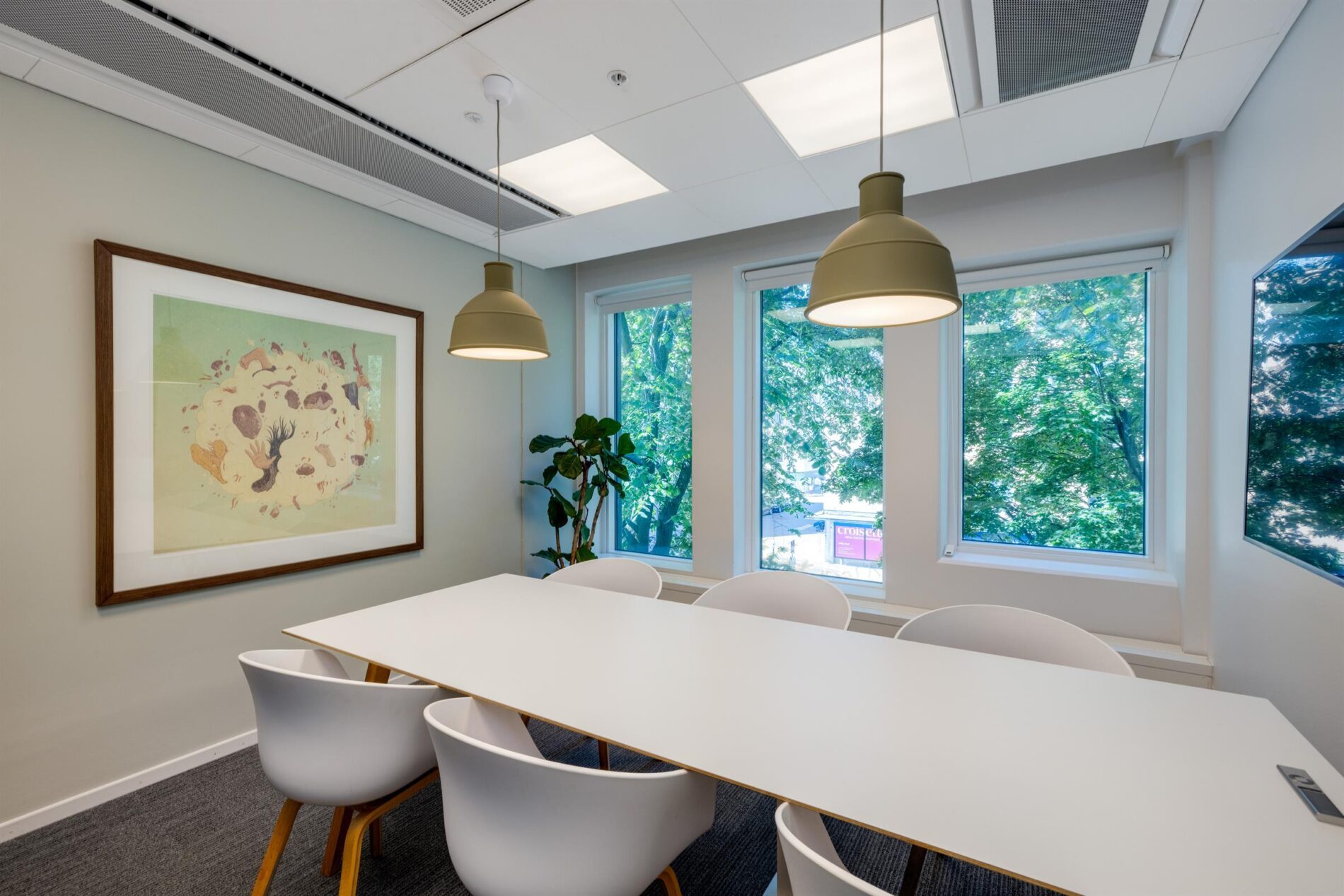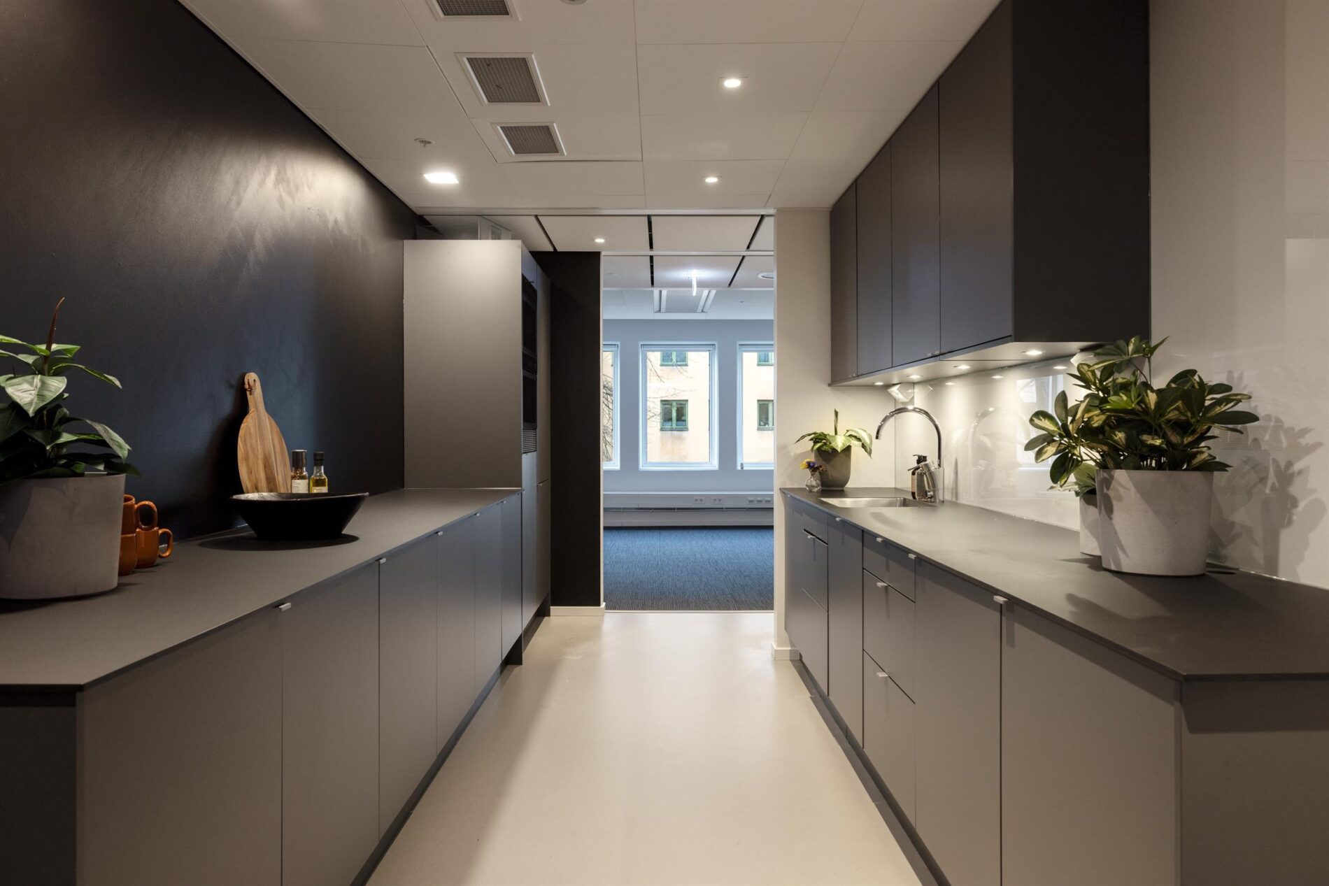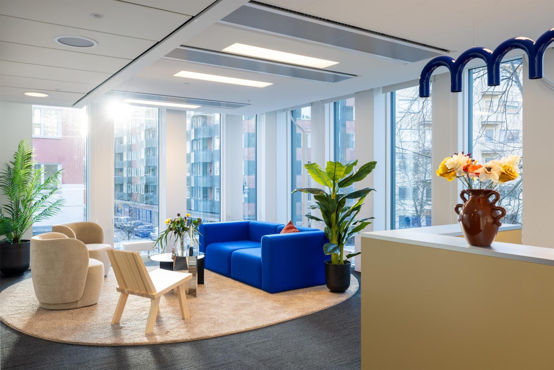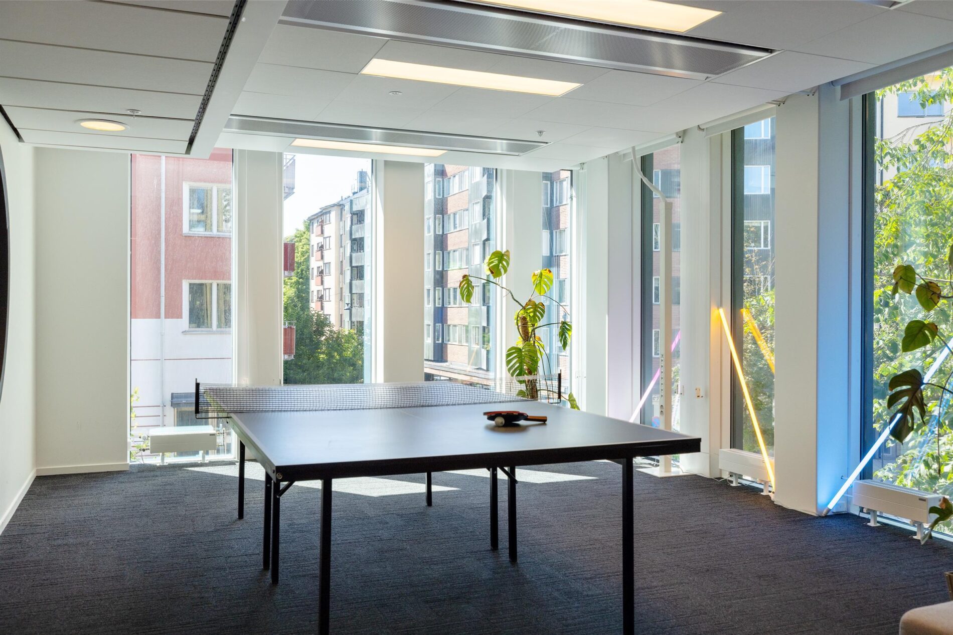 De stora fönstren skapar en ljus och luftig atmosfär. Här finns både små och större mötesrum, ett stort och trevligt pentry, naturligt uppdelade arbetsplatsytor samt en naturlig ”tyst” avdelning eller projektyta.