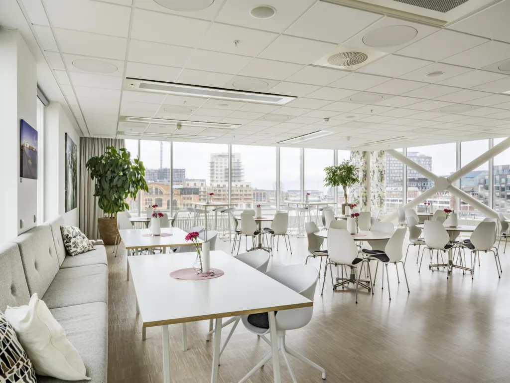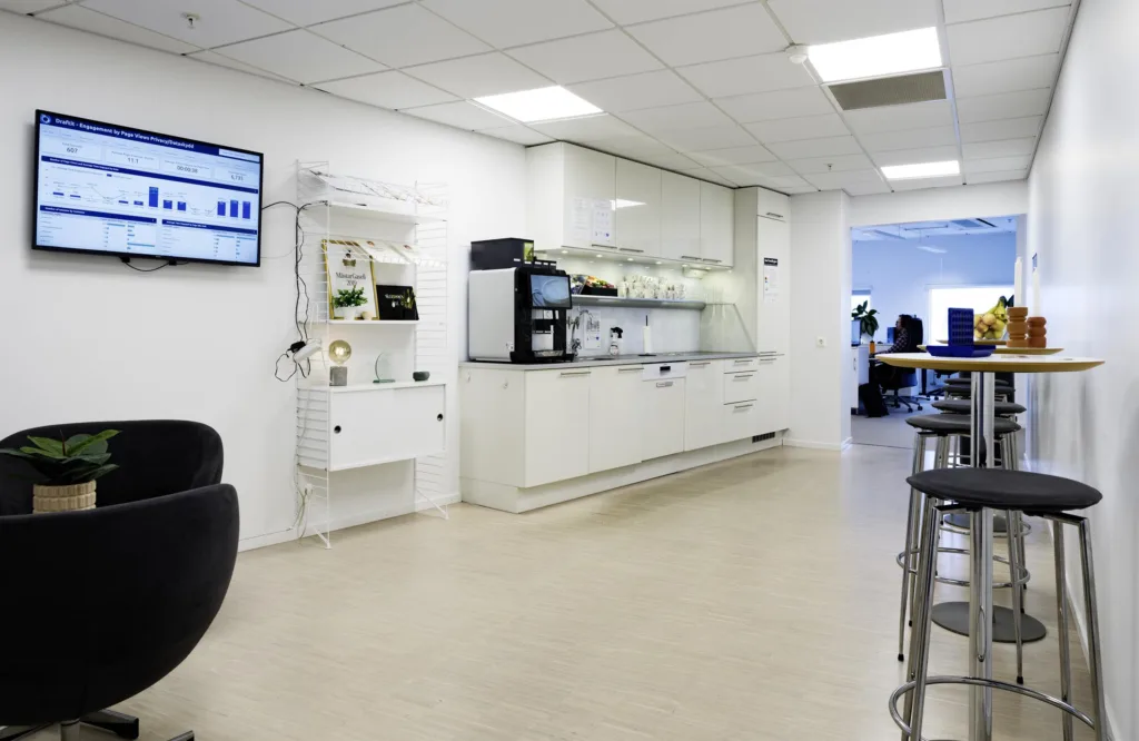Här kan ni hyra från 1400 kvadratmeter i ett plan upp till totalt 3150 kvadratmeter över tre plan. Lokalerna är moderna och välplanerade, vilket gör det möjligt att arbeta effektivt med spontana mötesplatser som främjar samarbete och kreativitet. Om ni hyr hela ytan får ni dessutom tillgång till översta planet med härliga gemensamhetsytor, stort pentry, pausyta och en egen terrass – perfekt för avkoppling eller informella möten.
