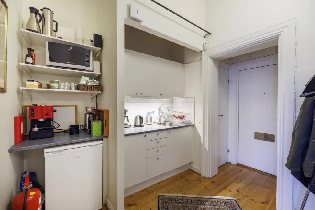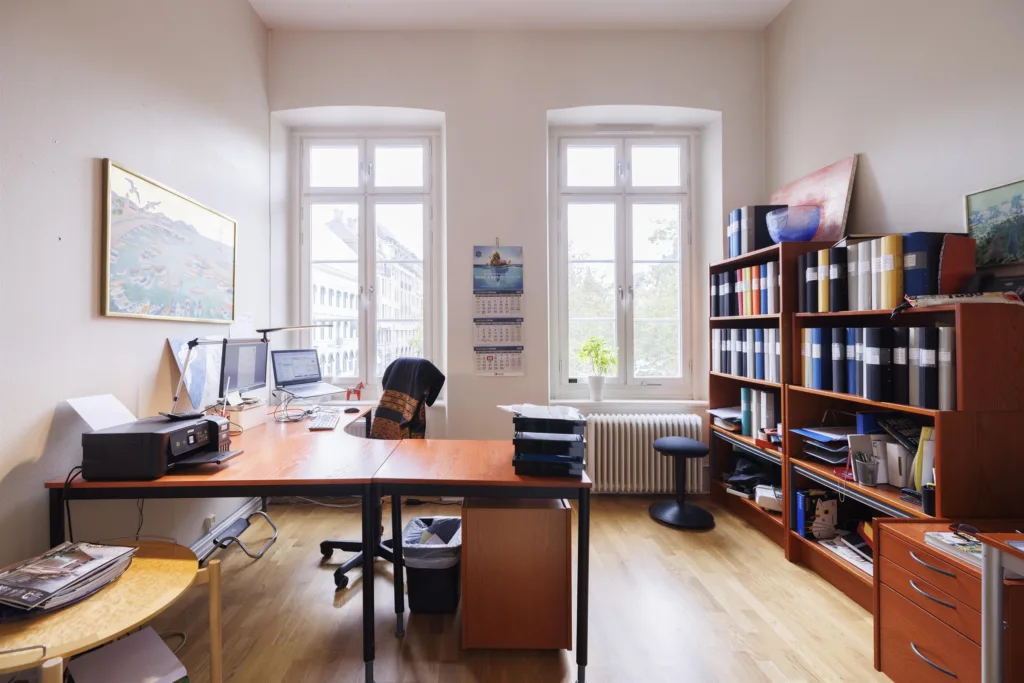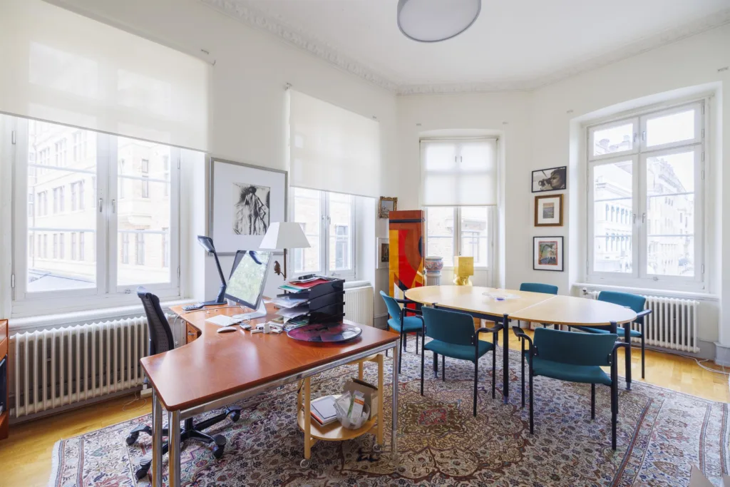 På hörnet mellan Stortorget och Lilla Torg ligger detta ljusa och karaktärsfulla kontor. De stora sekelskiftesfönstren, takhöjden och ljuset skapar rum med närvaro och rymd. Rummen ligger i fil längs fasaden, och i hörnet öppnar en fransk balkong upp mot utsikten över båda torgen – en unik detalj som gör att man verkligen känner staden.