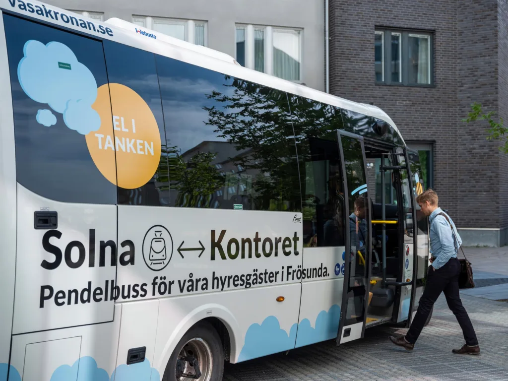 Miljöcertifierad fastighet med fasadskyltplatser och egen pendelbuss för hyresgäster