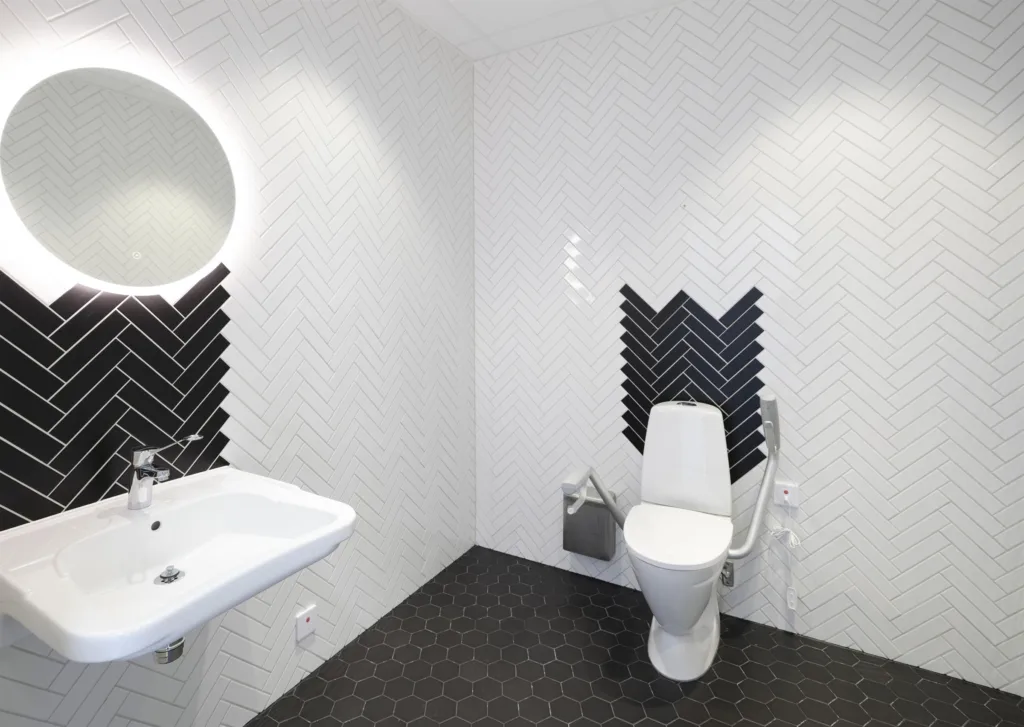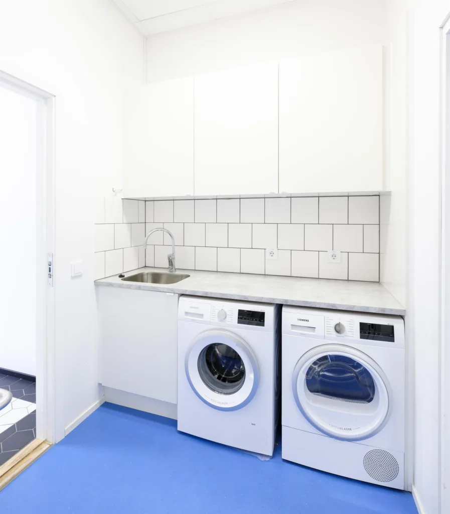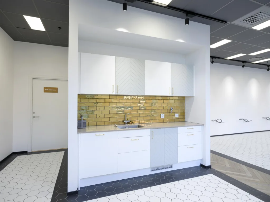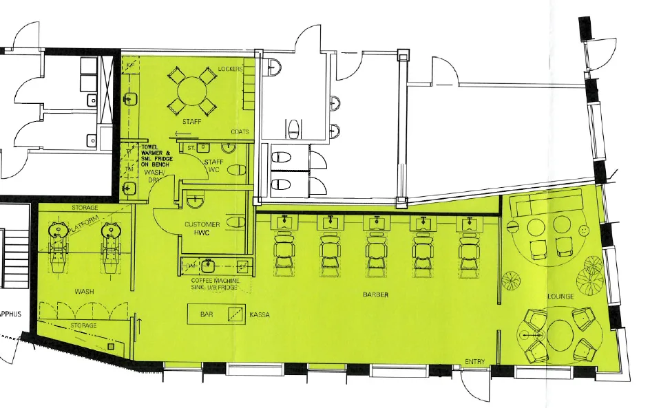 Lokalen omfattar 132 kvadratmeter och är redan planerad för frisörverksamhet. Här möts besökarna av en välkomnande lounge och väntrum direkt vid entrén. I salongsdelen finns plats för upp till sex frisörstolar i rad samt en tvättdel med förberett vatten och avlopp. För personalen finns omklädningsrum, wc och pausutrymmen, och även en kundtoalett finns på plats. Den genomtänkta planlösningen gör att både arbetsflöde och kundupplevelse fungerar smidigt från första dagen.