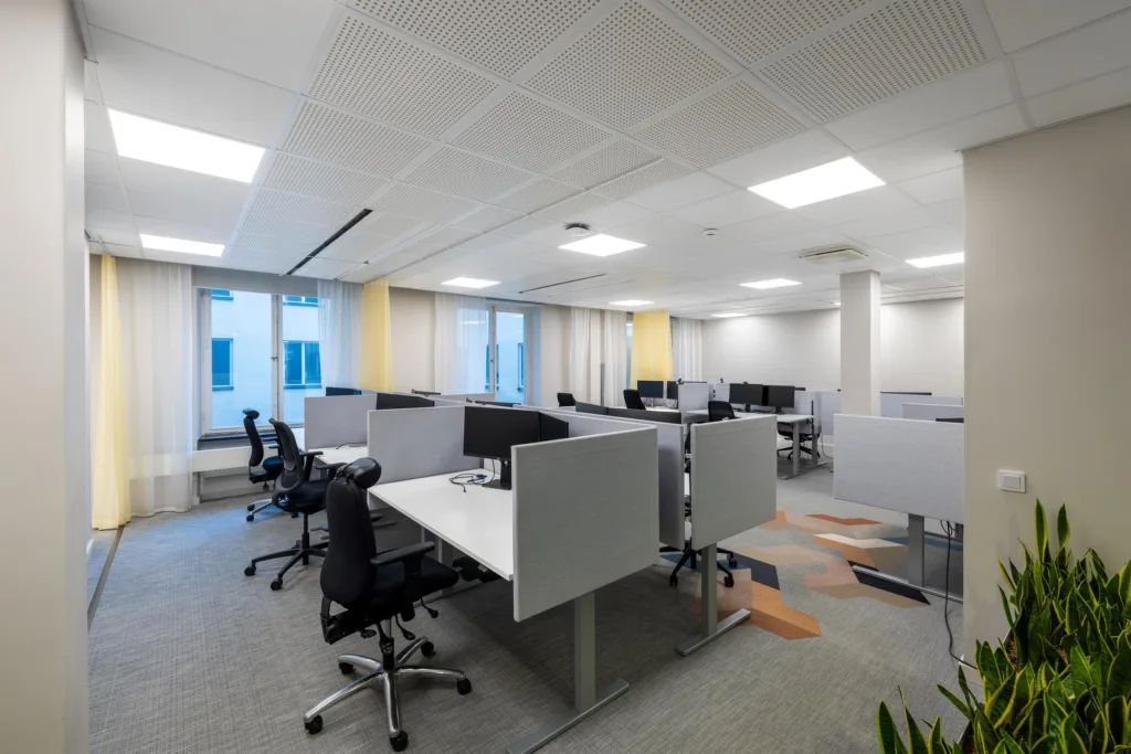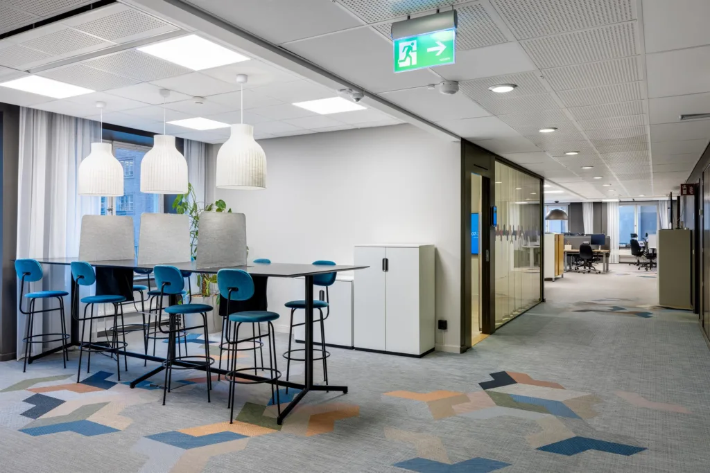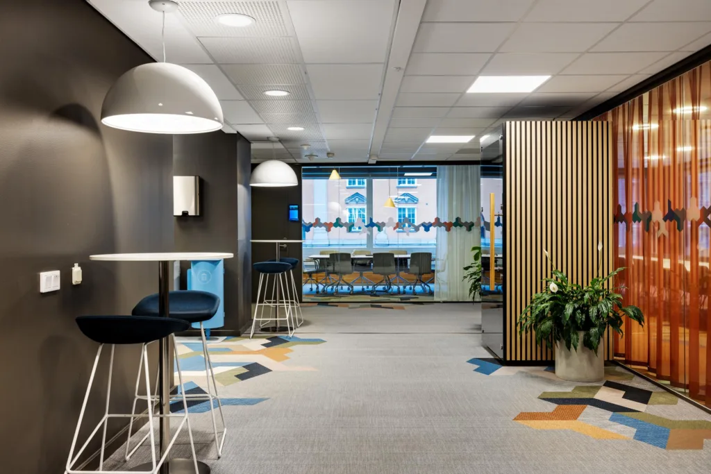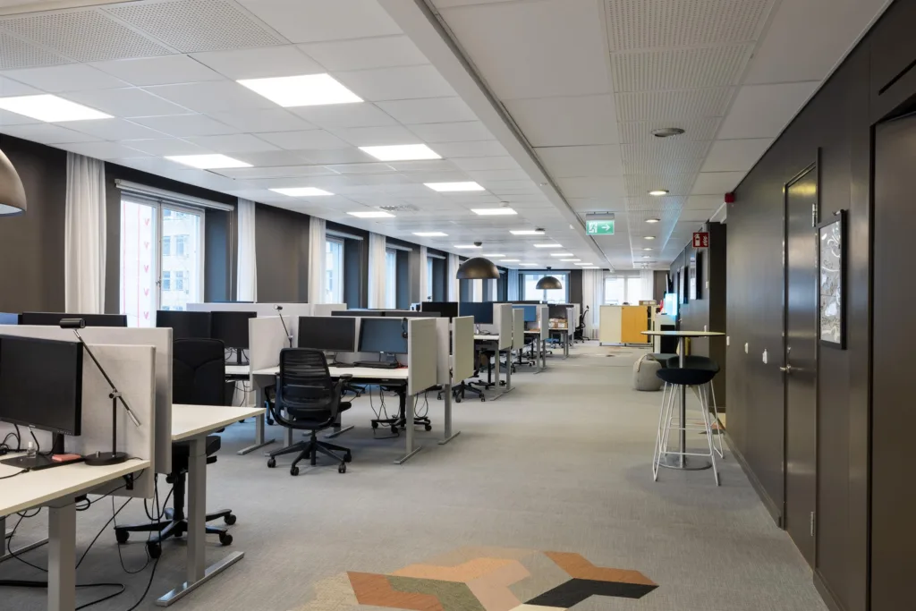 Lokalen har stora fönster och öppna ytor, vilket skapar en inspirerande miljö för över 130 medarbetare. Den yteffektiva planlösningen erbjuder ett flexibelt kontor där ni fritt kan röra er mellan arbetsstationerna. Här finns både öppna arbetsytor och avskilda rum, vilket gör det enkelt att växla mellan samarbete och fokuserade uppgifter.