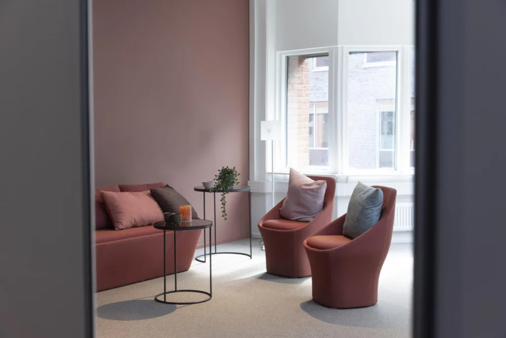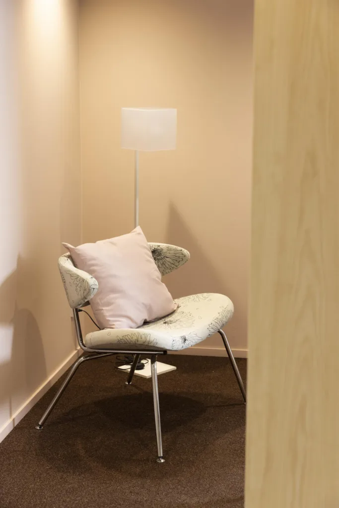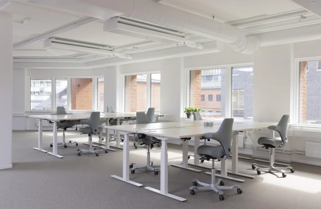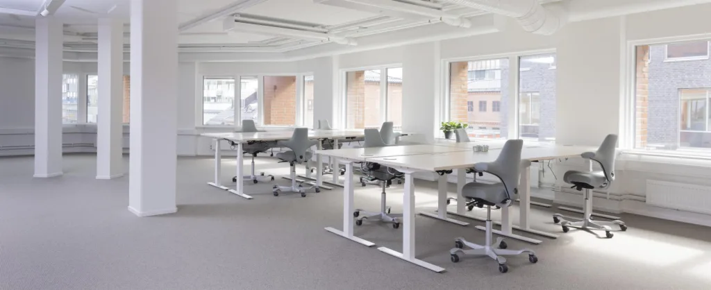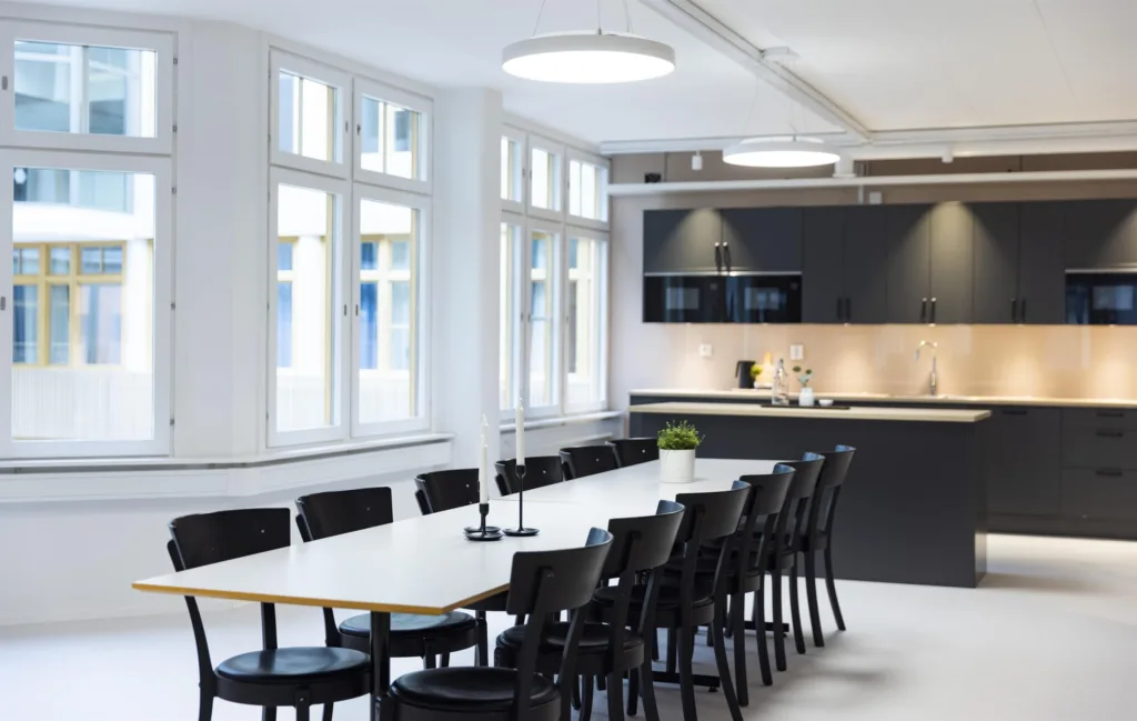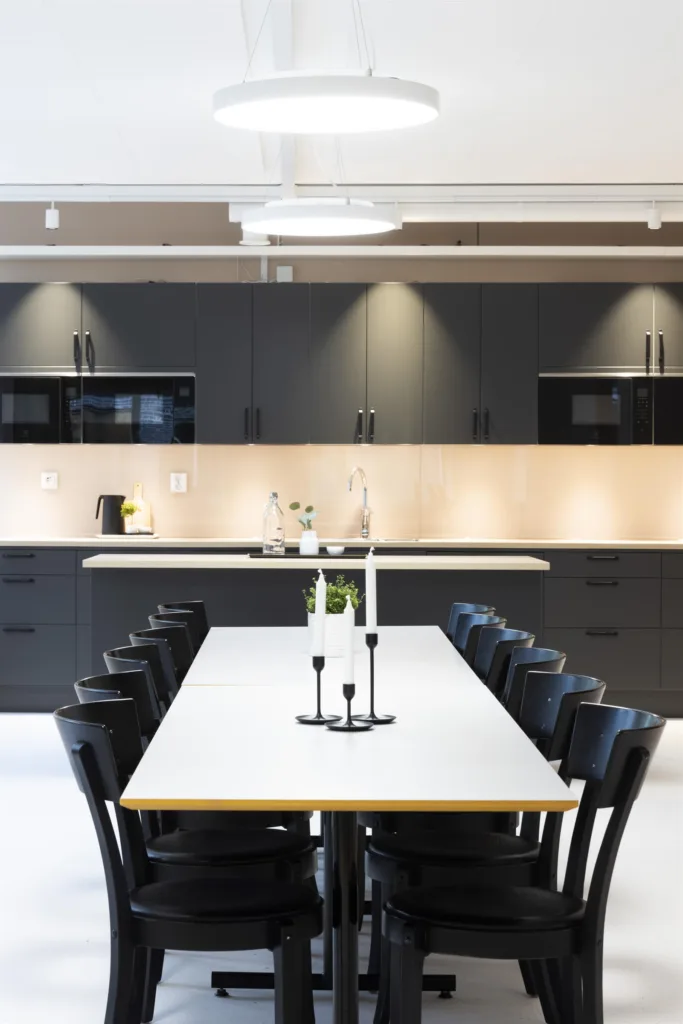 Färgsättningen är modern men lugn, vilket skapar en trivsam känsla genom hela lokalen. Det generösa pentryt fungerar som en naturlig mötesplats – för morgonkaffet, snabba avstämningar eller en paus mitt i dagen.