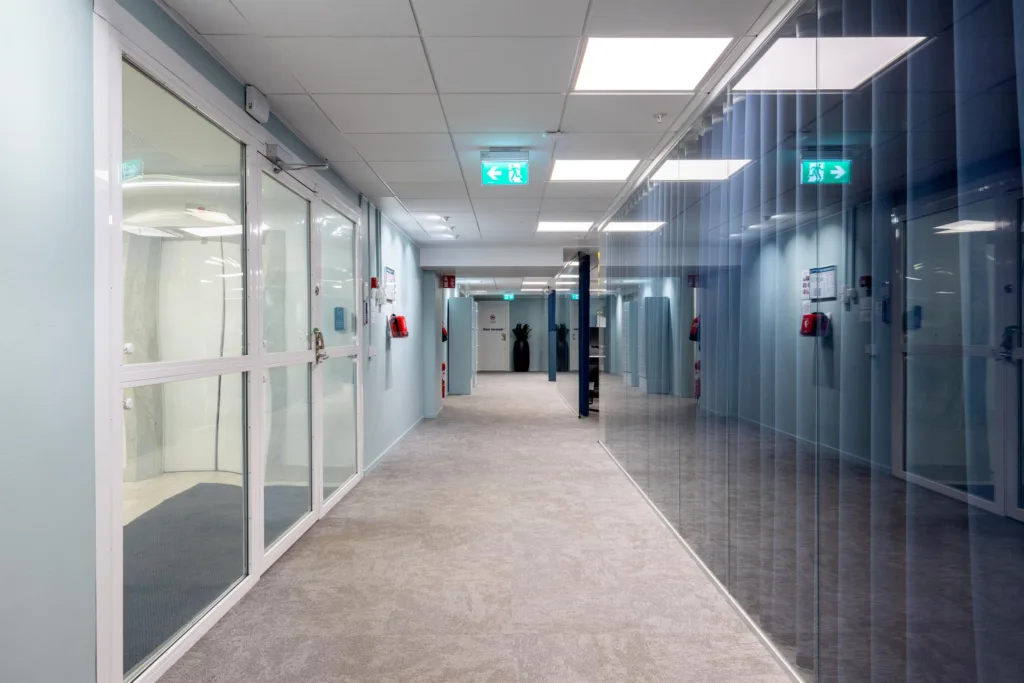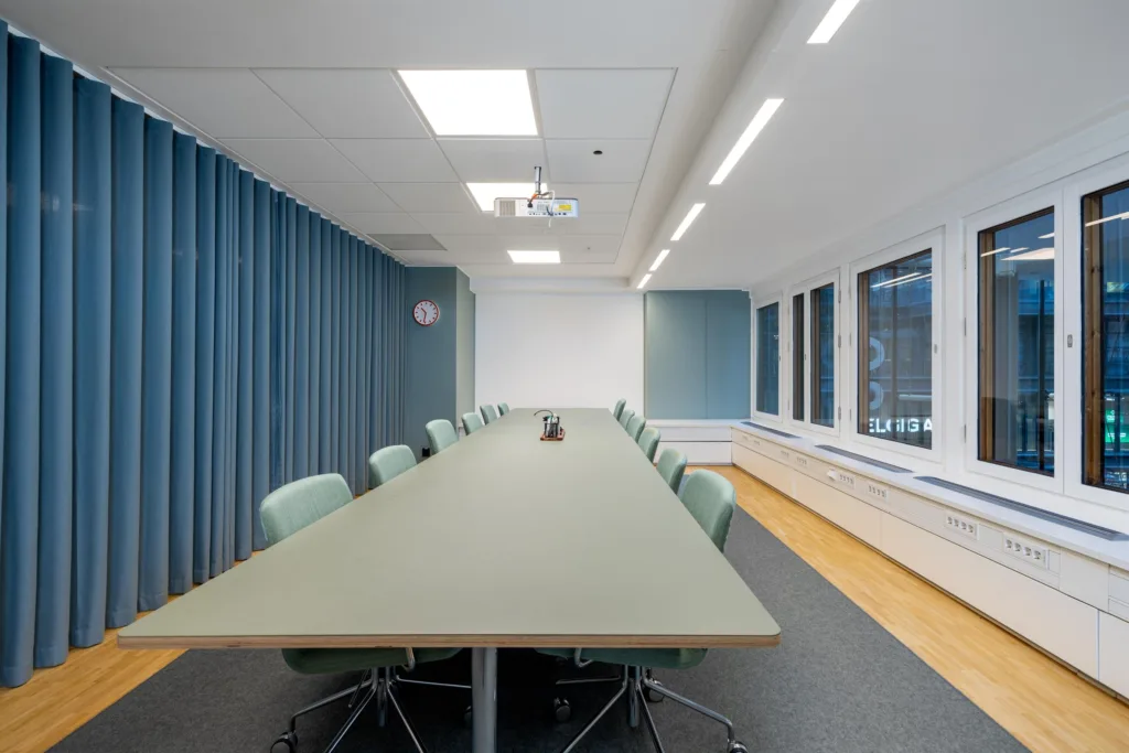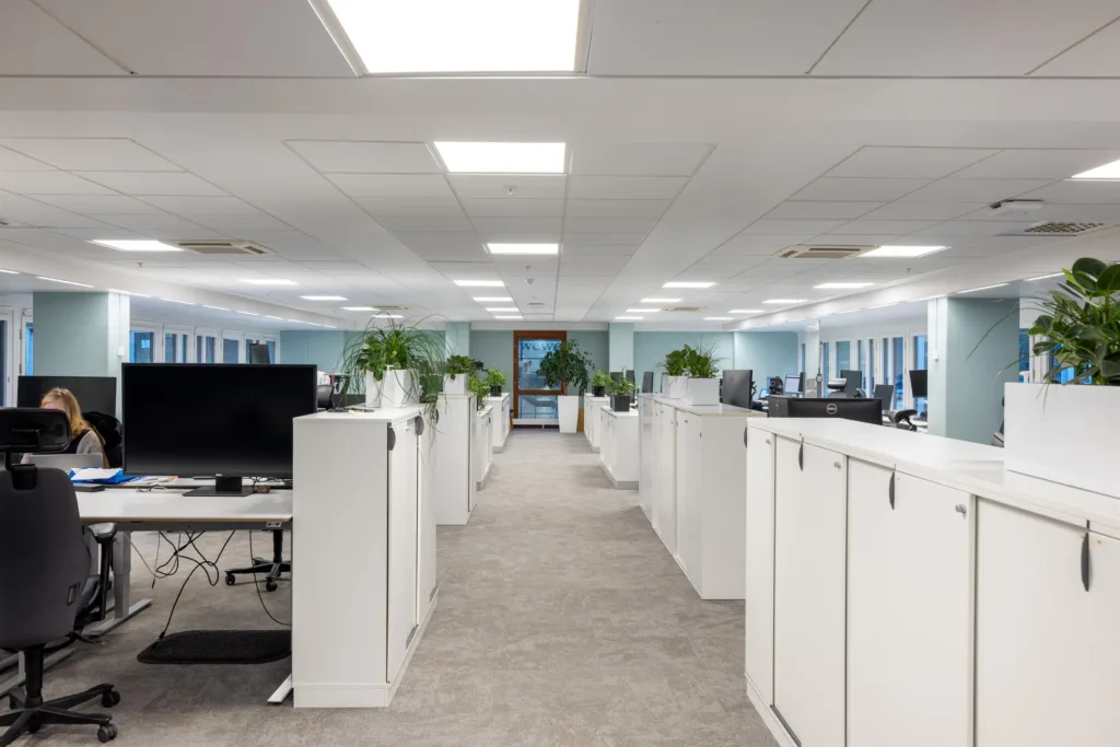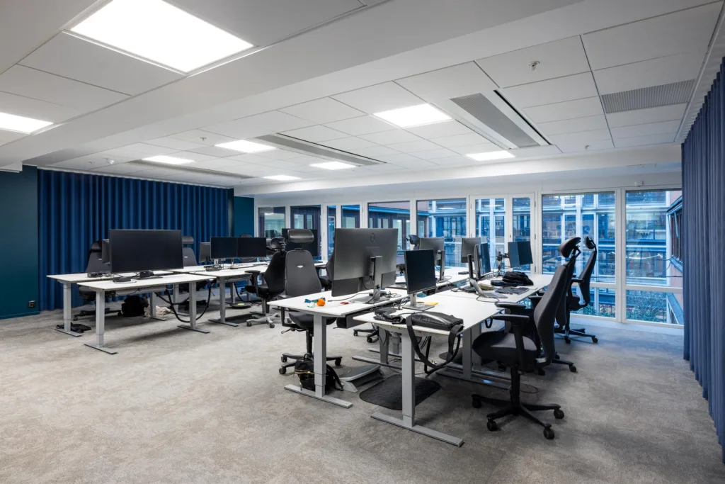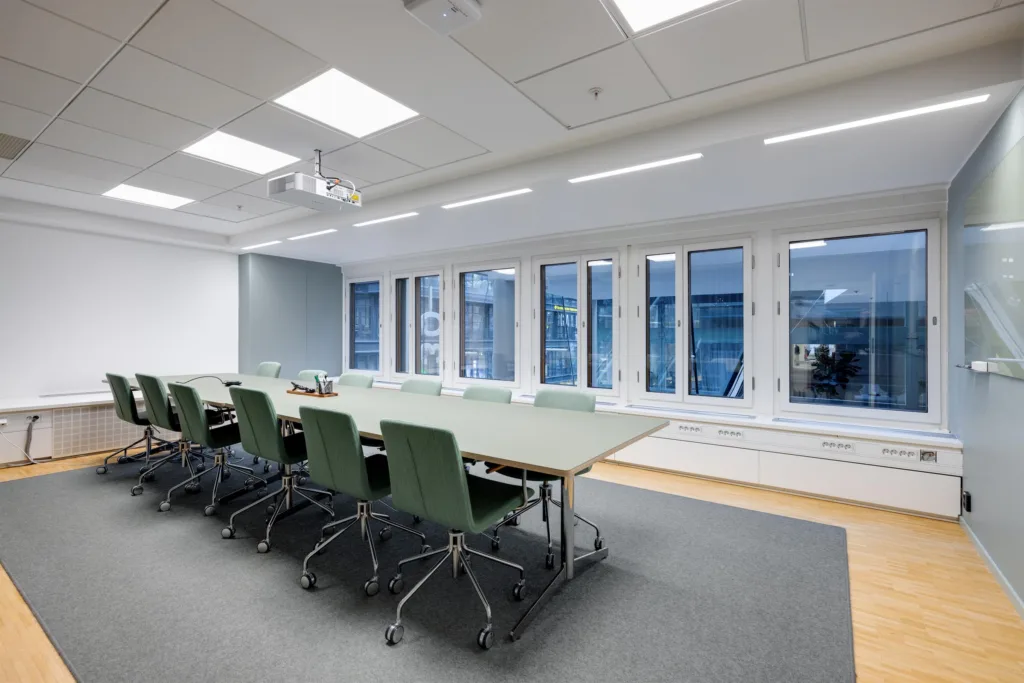 Vita väggar, parkettgolv och ljuddämpande mattor skapar en behaglig atmosfär. Glaspartier separerar kontorsrum från det öppna landskapet och låter det naturliga ljuset flöda fritt, vilket ger en luftig känsla.