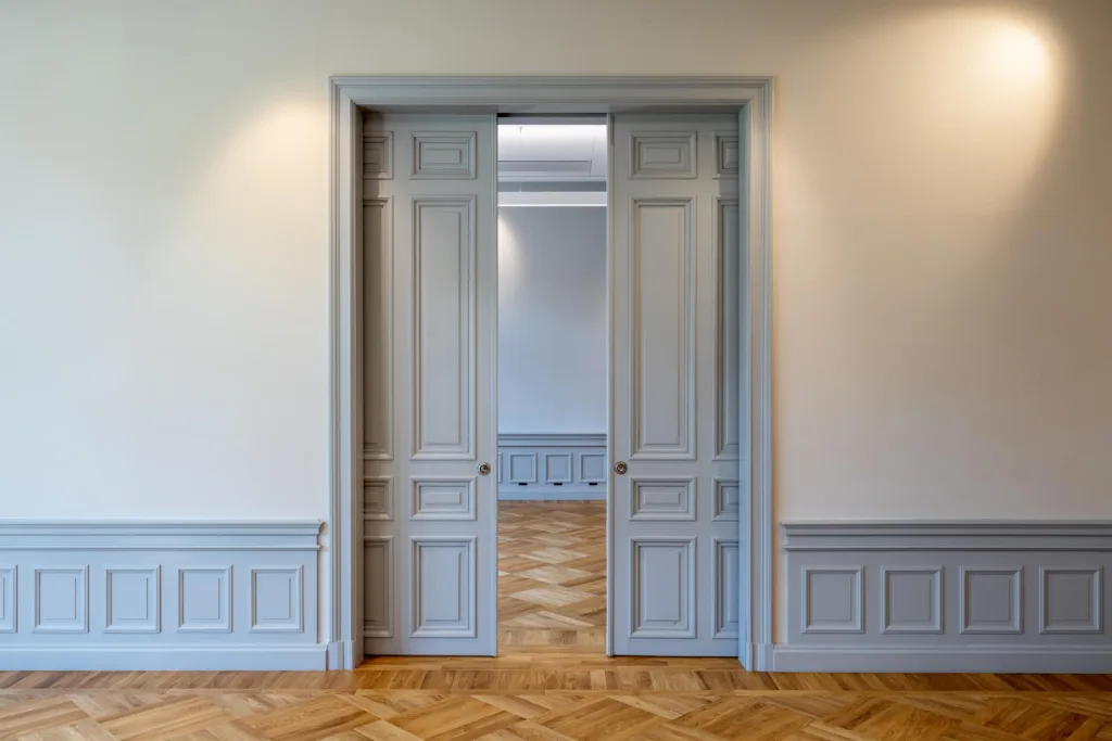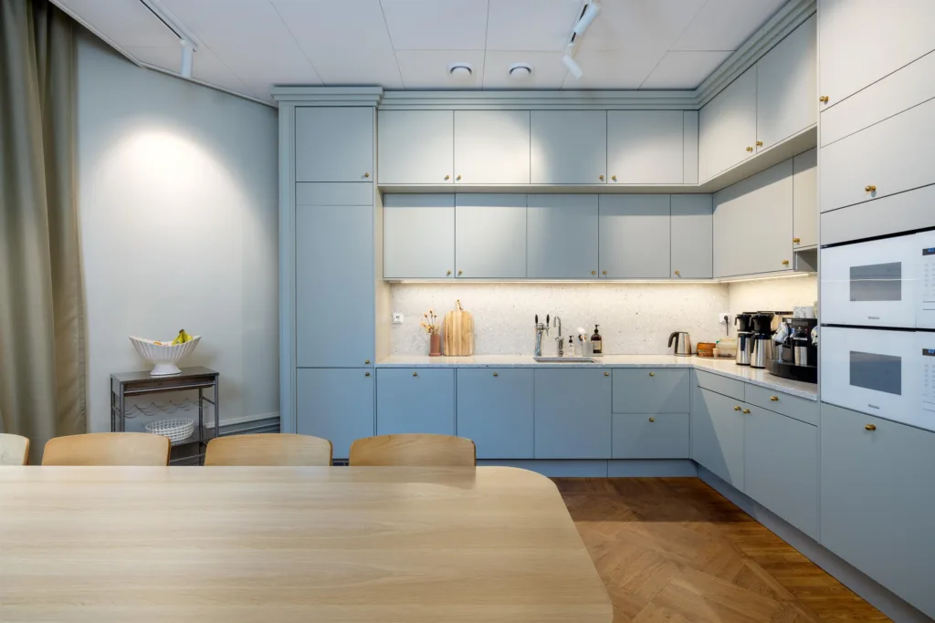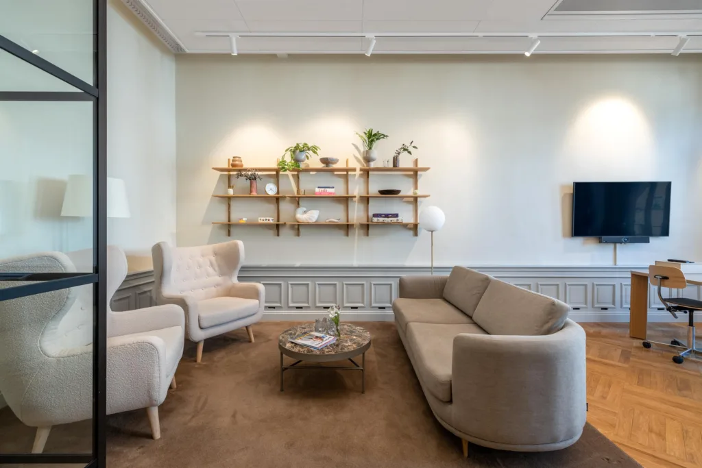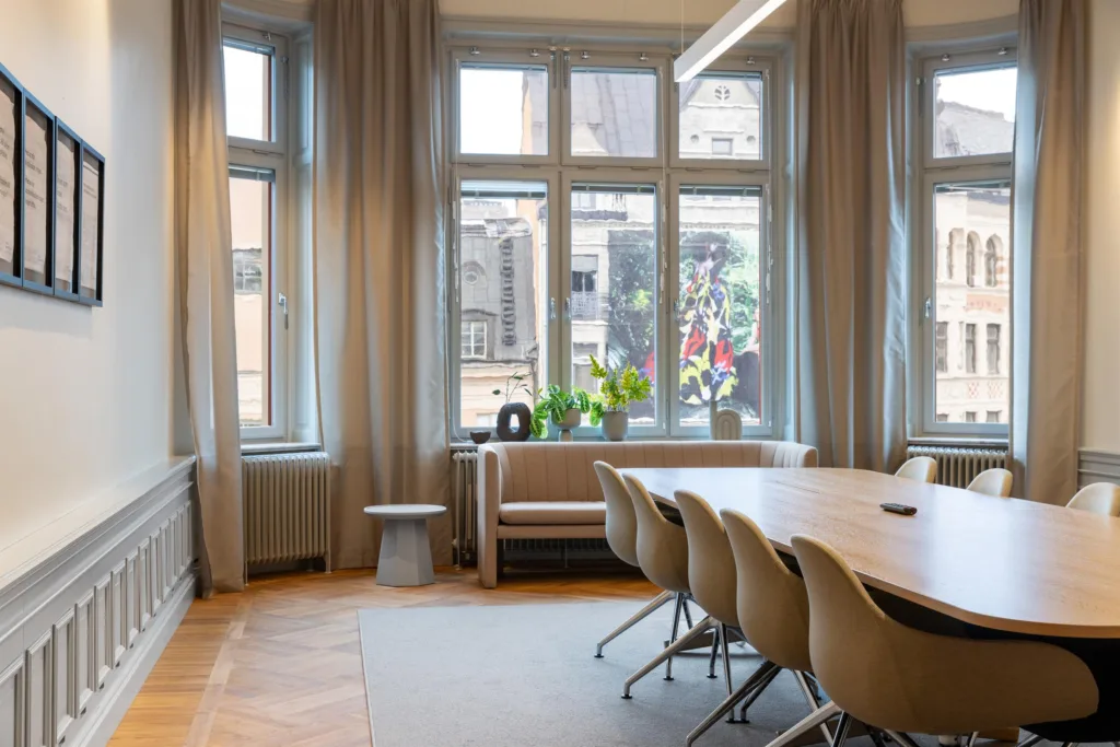 Här flödar ljuset genom höga fönster och rummen präglas av vackra detaljer som fiskbensparkett, pardörrar och generös takhöjd. Planlösningen rymmer både mötesrum, fokusrum, sociala ytor och en gemensam innergård – allt för att skapa balans mellan arbete och paus.
