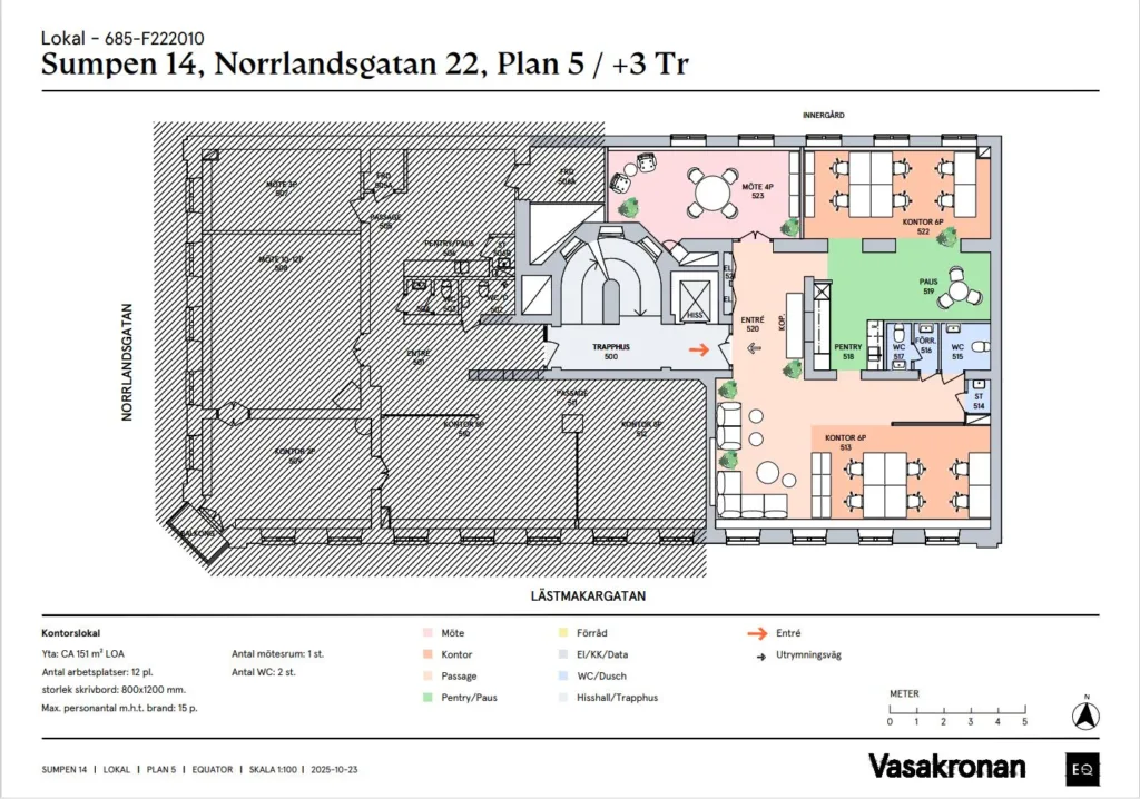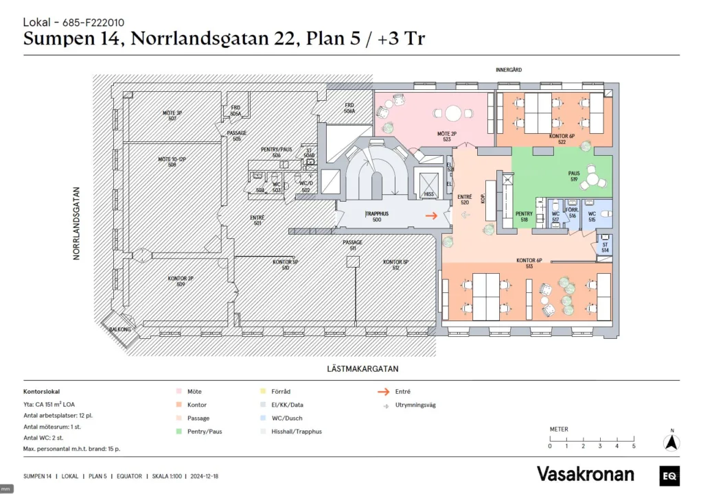 Näst högst upp i huset, på Norrlandsgatan 22, väntar en arbetsplats som kombinerar ljus, rymd och ett oslagbart cityläge. Lokalen om 151 kvm är perfekt dimensionerad för cirka 12 arbetsplatser och erbjuder en arbetsmiljö där trivsel och effektivitet går hand i hand.