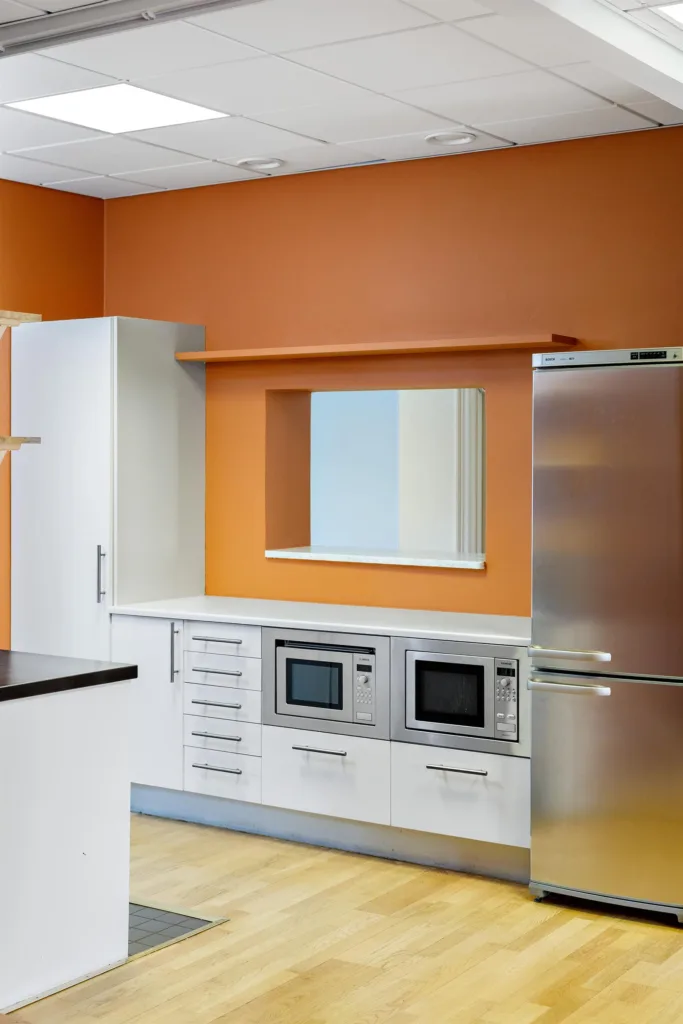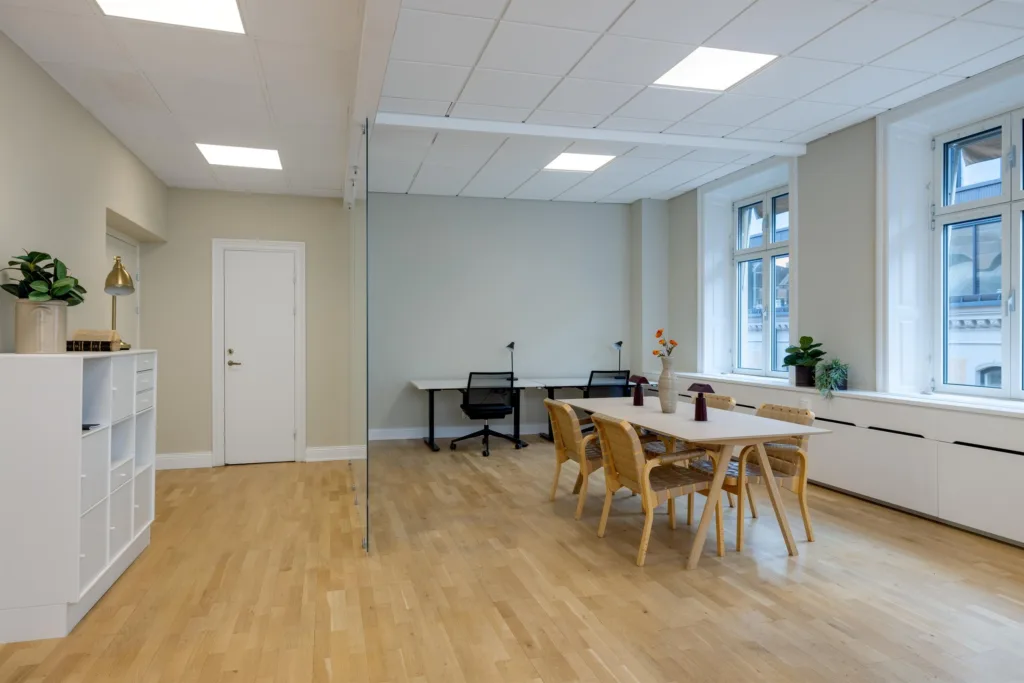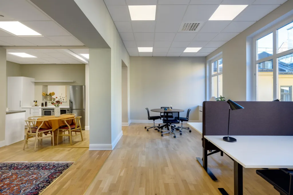 Genom stora fönster flödar dagsljuset in och ger en öppen och inspirerande känsla. Planlösningen är yteffektiv och flexibel, vilket gör det enkelt att skapa en balans mellan gemensamma ytor för samarbete och rum för mer fokuserade uppgifter.