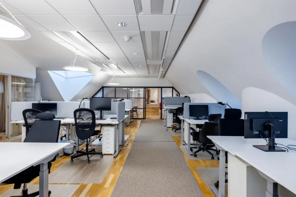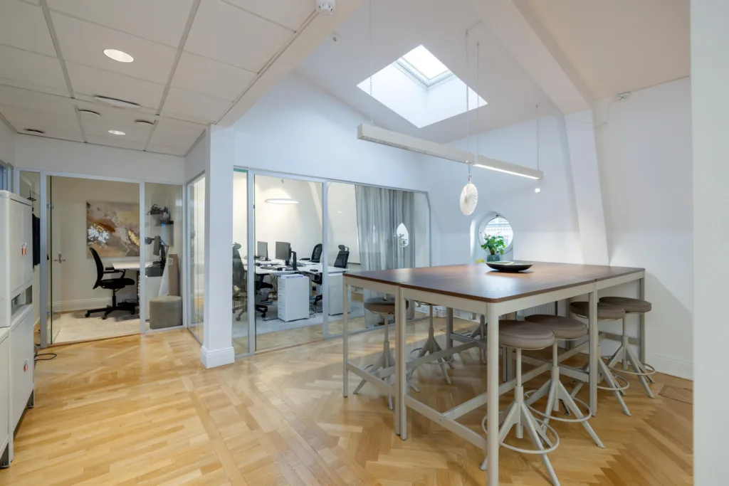 Högt upp i en miljöcertifierad fastighet ligger denna effektiva och yteffektiva vindsvåning med plats för 29 arbetsplatser. Lokalen har ett härligt ljusinsläpp och en genomtänkt planlösning som skapar en trivsam och inspirerande arbetsmiljö.