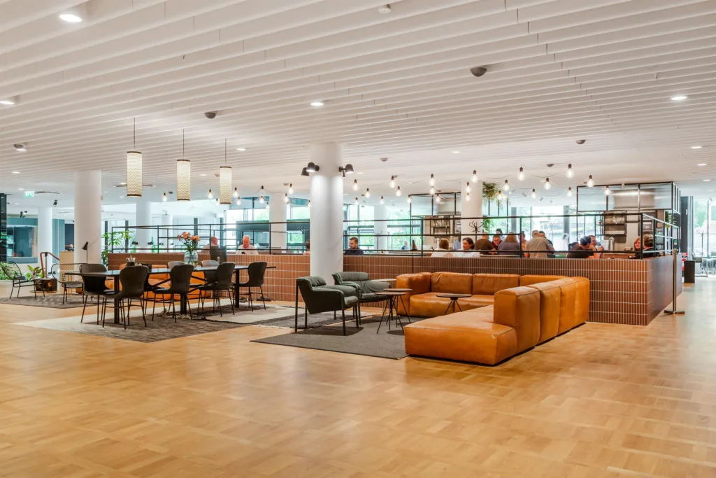 Vid den representativa huvudentrén välkomnas besökare av en restaurang och en ljus lobby med öppna ytor för event, mingel och spontana möten samt imponerande sju meter i takhöjd. På taket finns nio unika pods med magnifik utsikt.