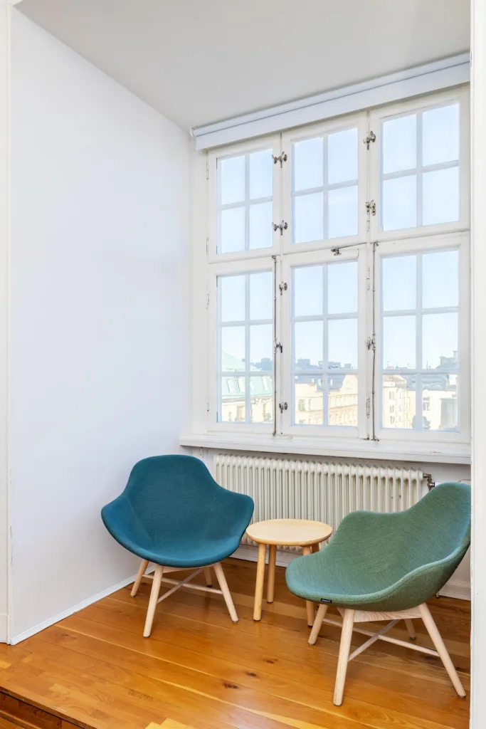 Planlösningen kombinerar storrumslösning med mötesrum och avskilda ytor. Det gör det enkelt att samla teamet i det gemensamma tempot och samtidigt ge utrymme för fokus, samtal och kundmöten. Vackra ektiljor på golven, spegeldörrar och bevarade detaljer från husets tidiga år ger karaktär och en tydlig identitet, medan moderna installationer säkerställer en jämn och behaglig klimatkomfort under hela arbetsdagen.