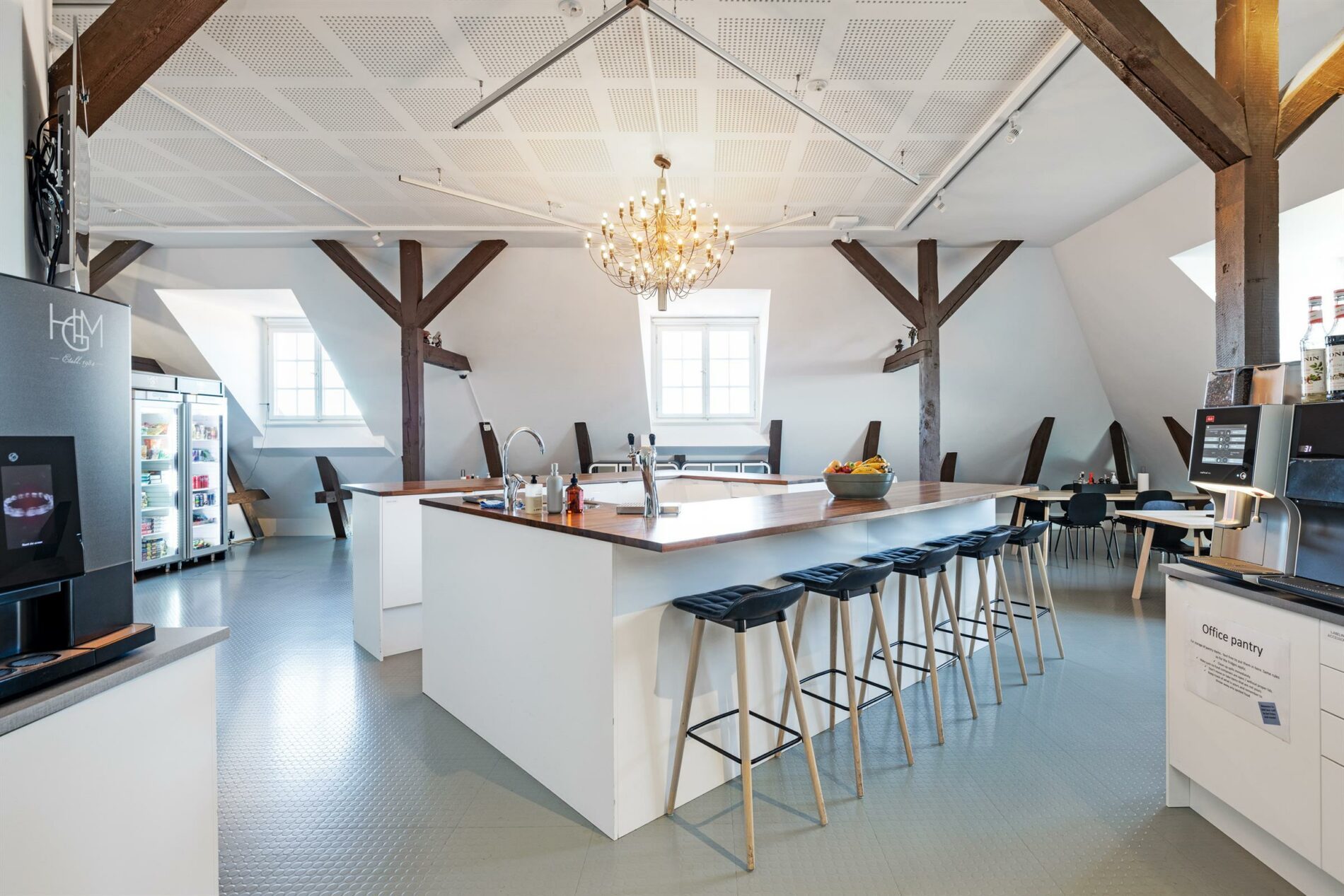 Välkommen till en magisk vindslokal på översta våningen med utsikt. Här jobbar ni bland synliga bjälkar, vindskupor och takfönster och får fantastiska vyer över Östermalms takåsar, tinnar och torn. Med en öppen planlösning där vita väggar, trägolv och spröjsade fönster ger denna lokal ett otroligt ljus för en inspirerande arbetsmiljö. I lokalen finns rum för möten och samtal, wc med dusch och ett stort och härligt socialt pentry för lunchen eller kanske mingel.