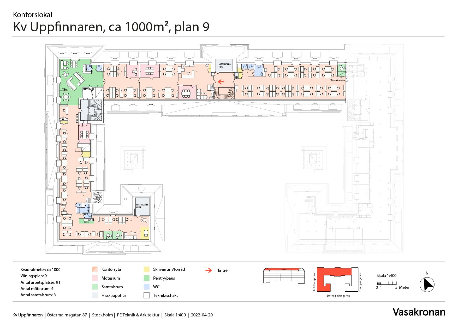 Kvarteren erbjuder allt man kan önska, såsom shopping, Karlaplans tunnelbana, parker samt många bra restauranger, caféer och gym. Cyklar parkeras på gården och den bilburna kan hyra garageplats i huset eller i närliggande garage. Med bussar precis utanför och läget mitt mellan city och grönområden blir det här en arbetsplats dit alla enkelt tar sig och kommer att trivas.
